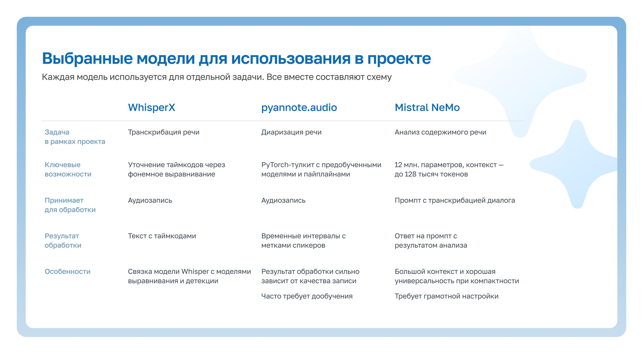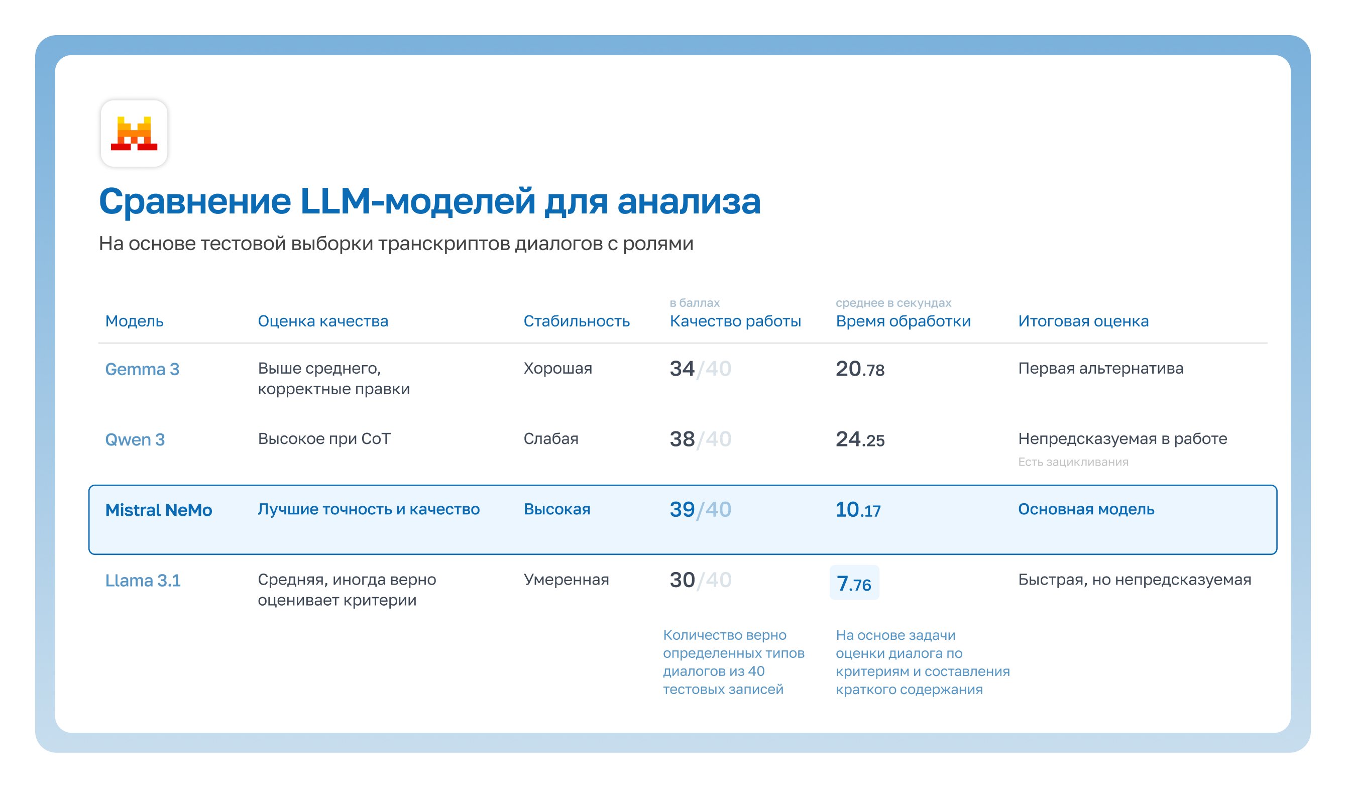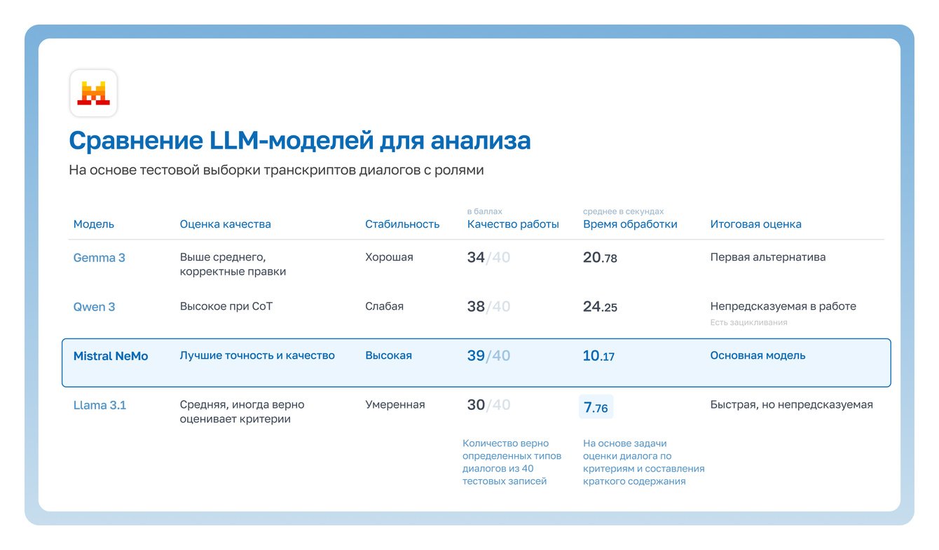 К такому набору мы пришли не сразу: на старте было неочевидно, какие модели использовать. Например, одни модели хорошо справлялись с распознаванием речи, но «плыли» на длинных звонках. Другие корректно интерпретировали смысл диалога, но были нестабильны по структуре вывода.