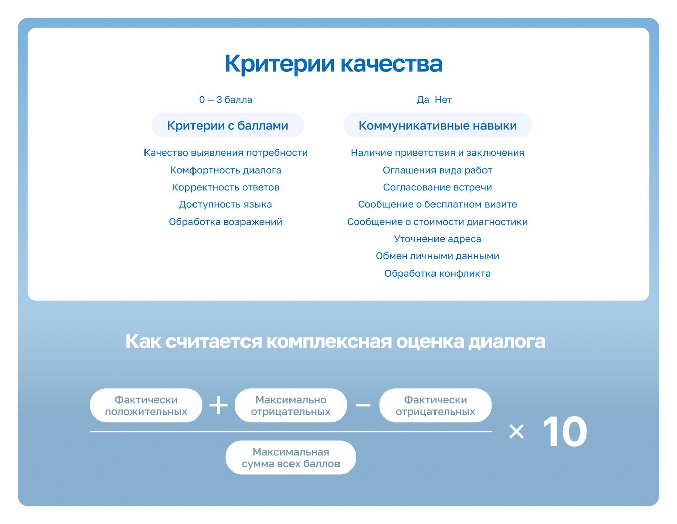 Финальный результат учитывает и то, что сотрудник сделал правильно, и то, каких ошибок избежал, и даёт честную оценку по шкале от 0 до 10 — руководителю сразу понятно, где проблемы в коммуникации с клиентом, а где зафиксированы конкретные отклонения от стандартов работы.