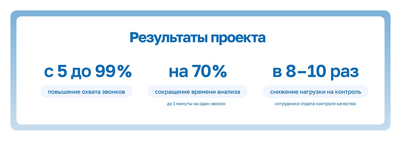 За три месяца мы разработали и внедрили систему речевой аналитики, которая закрыла ключевые задачи контакт-центра: масштабирование процесса без найма, данные для аналитики и работа с клиентами.