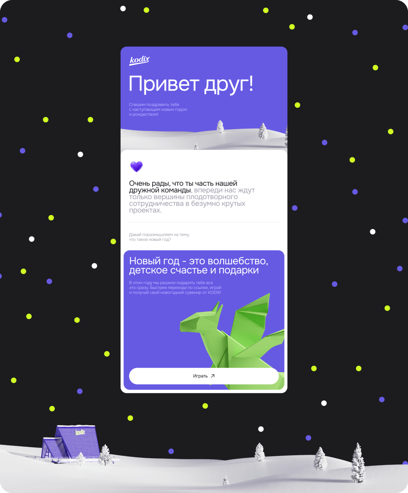 Погрузитесь в наше волшебный мир новогоднего настроения KODIX и почувствуйте радость и тепло, которые мы вложили в эту игру. Приглашаем вас окунуться в удивительные приключения и насладиться праздничным настроением вместе с нами!