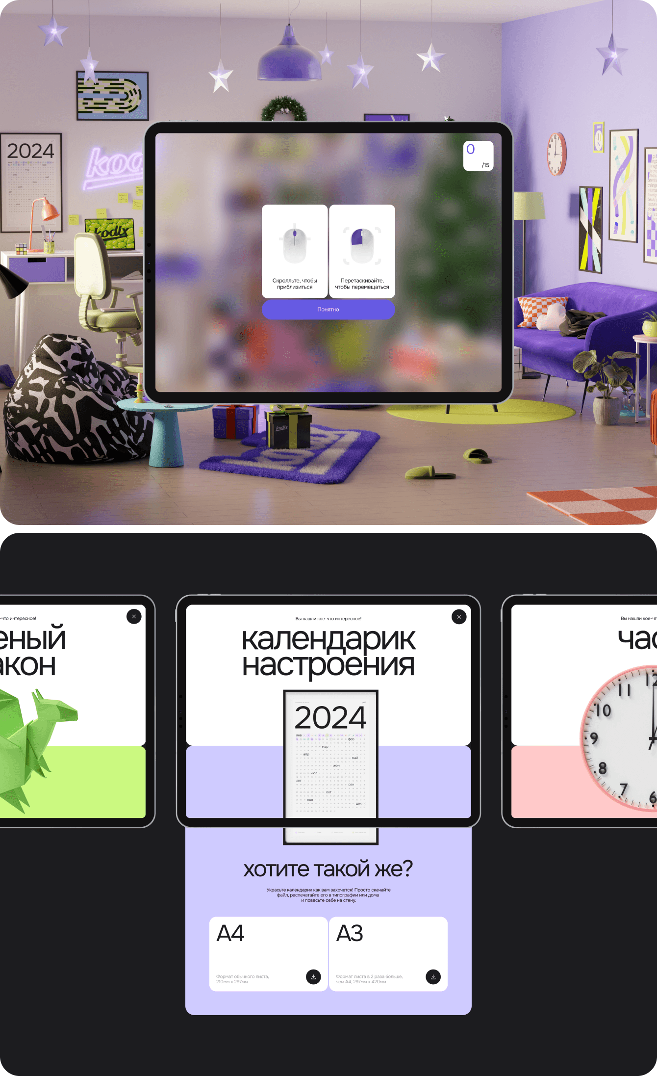 Мы вдохновились мобильной игрой Hidden City и решили создать свой собственный уникальный уровень под названием KODIX HOLIDAY! В комнате спрятали 15 предметов, каждый из которых либо связан с нашей командой и нашими проектами, либо специально создан для новогоднего настроения и праздничного веселья.