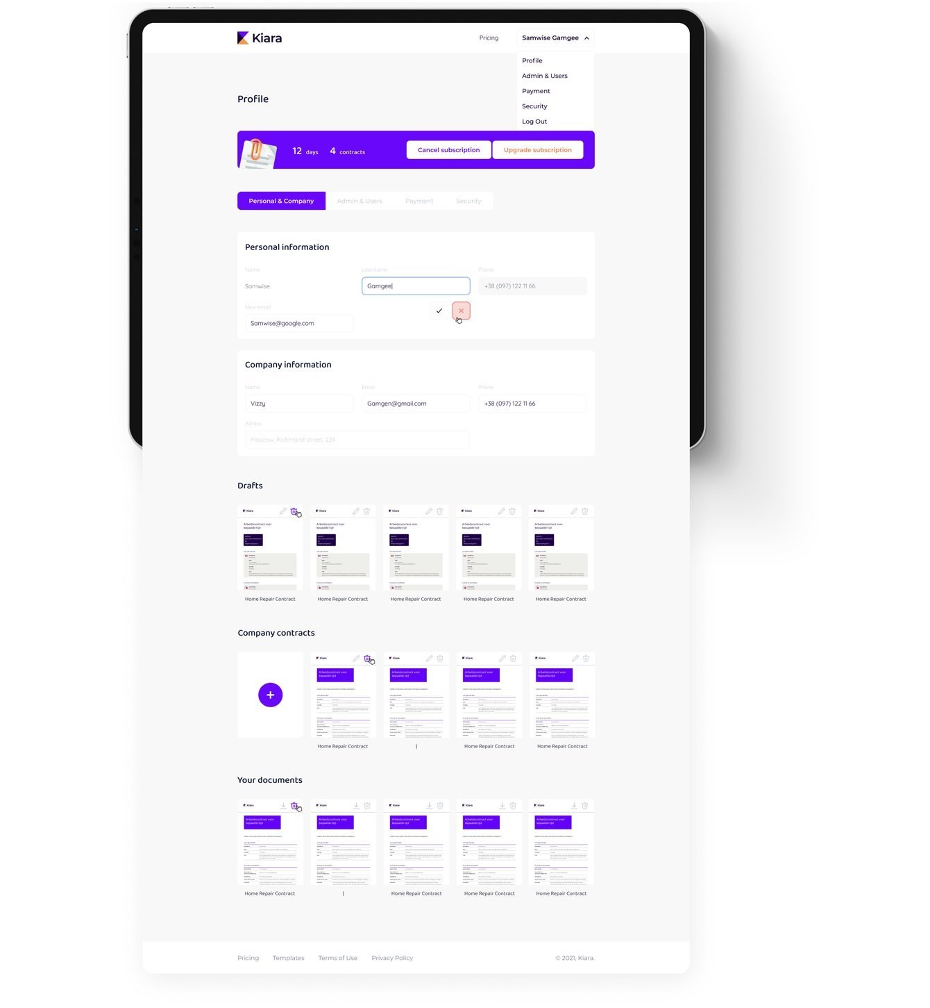 В личном кабинете пользователь может сохранять шаблоны часто используемых контрактов и скачивать ранее созданные документы.