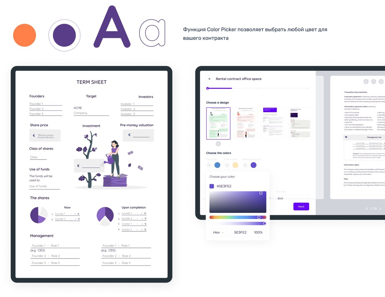 Основной функционал сервиса - конструктор контрактов. С его помощью пользователь может выбрать один из предложенных шаблонов документов, изменить его цвет, тип и размер шрифта, заполнить свои данные и отправить на подпись.