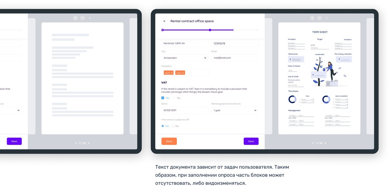 Основной задачей было разработать сервис для создания контрактов и договоров без дополнительного обращения к юристам.