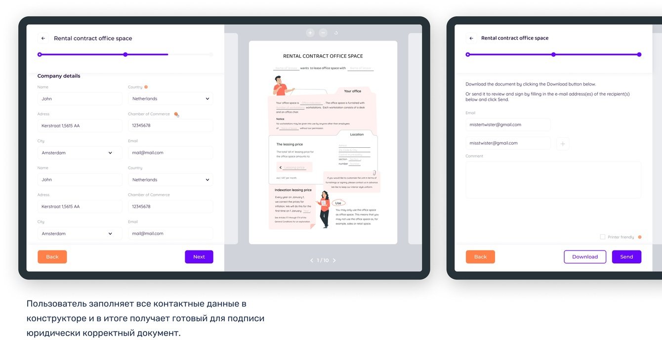 Мы разработали конструктор документов, с помощью которого пользователи могут заполнить шаблон контракта под свои нужды и электронно подписать его.
