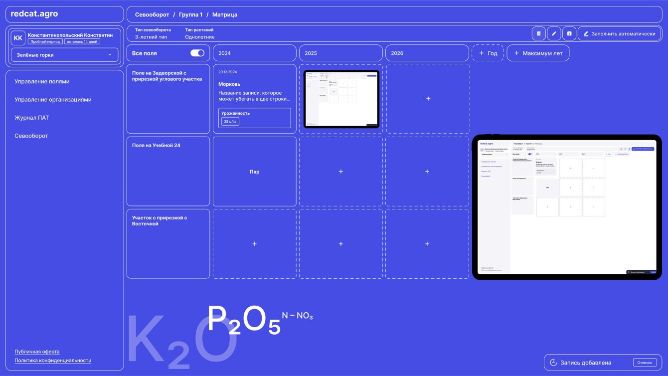 Реализовали сервис, который помогает пользователю определиться с необходимым количеством ресурсов для посадок/уборки культуры и спланировать дальнейшие работы на поле.