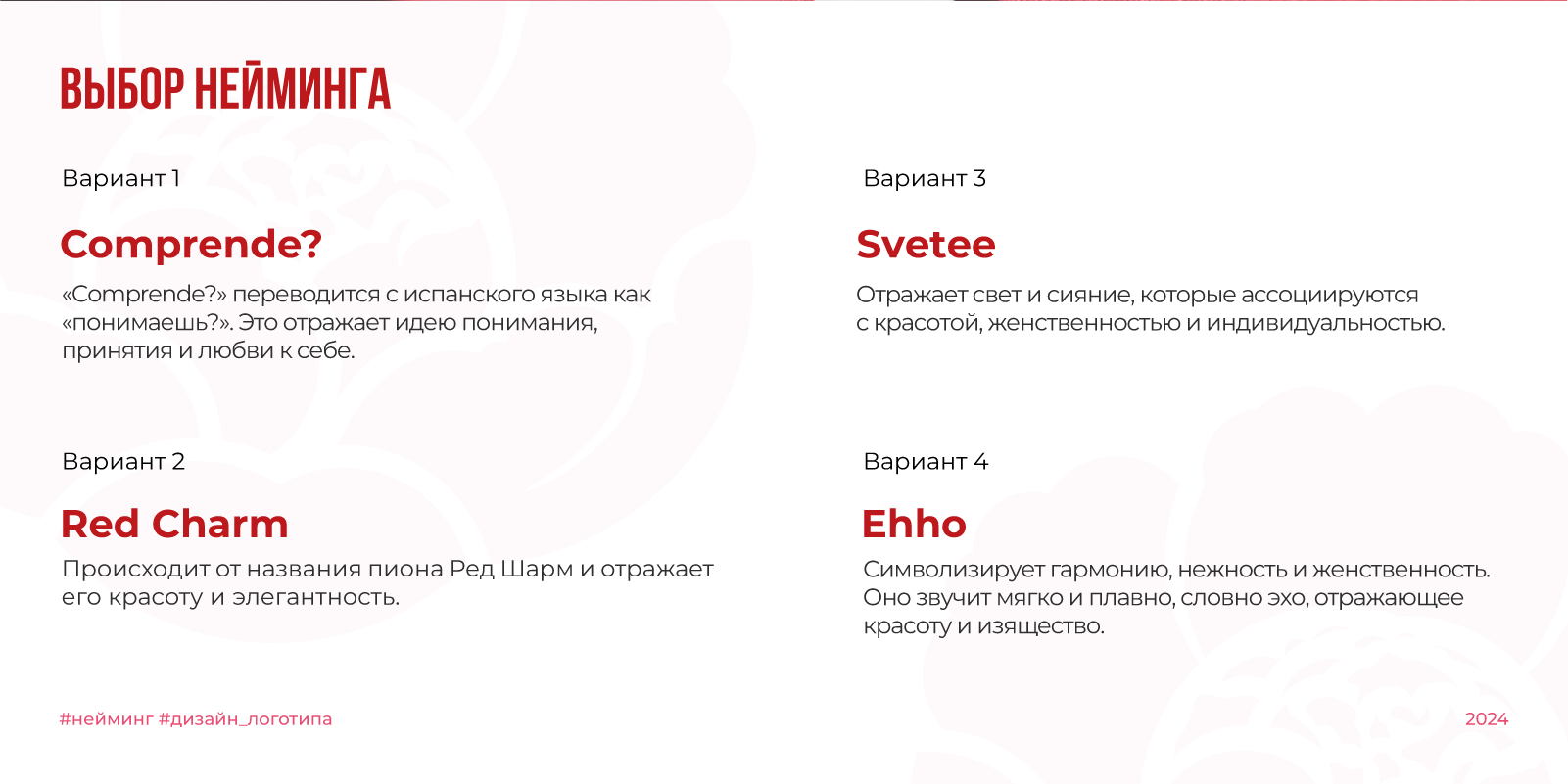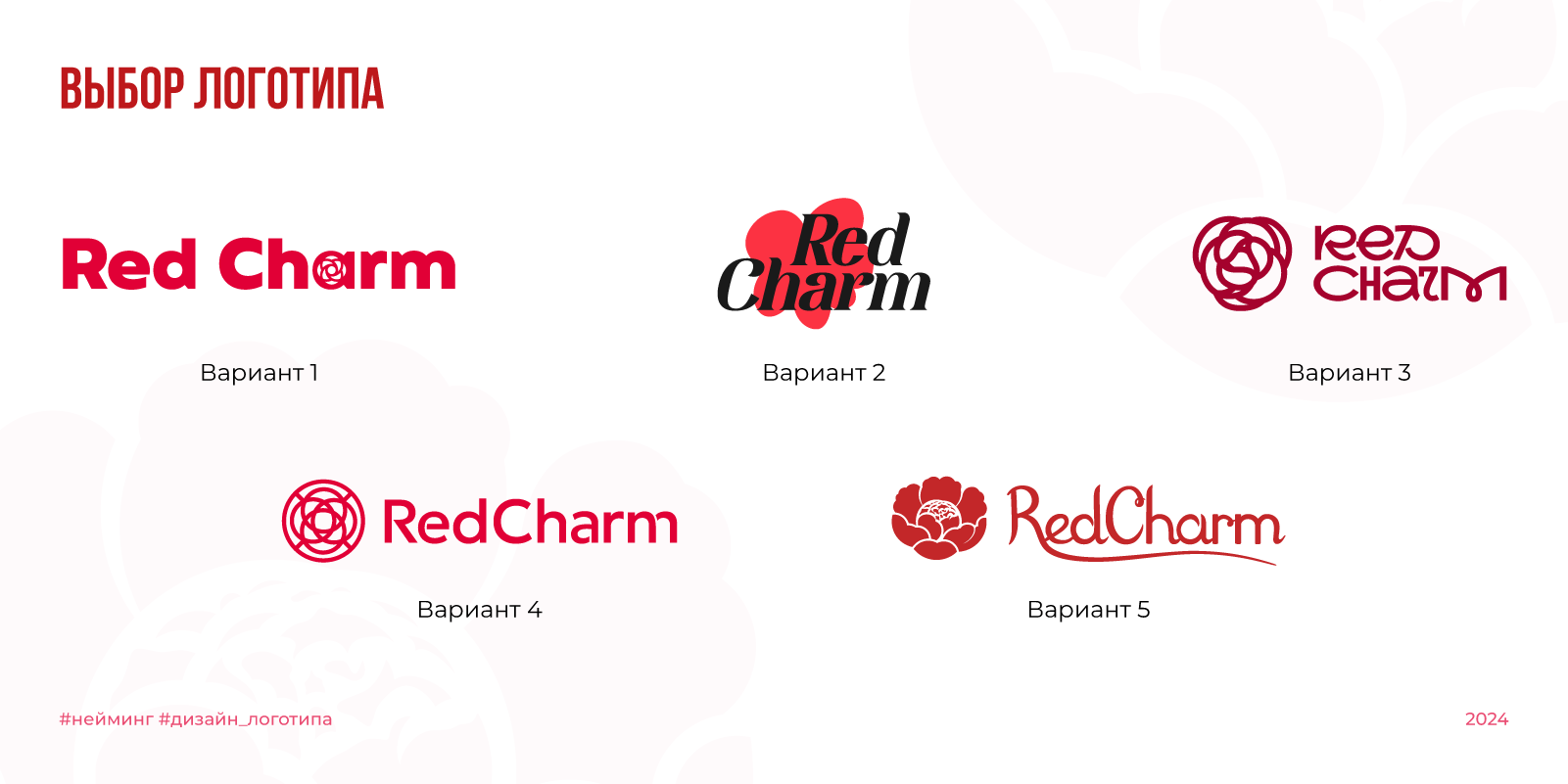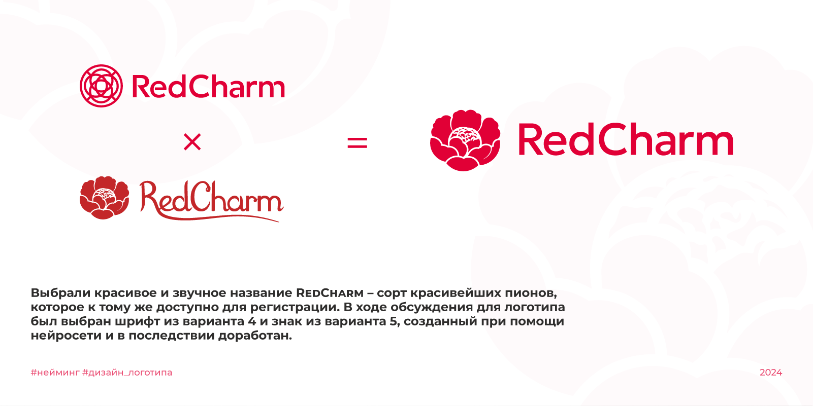 Выбрали красивое и звучное название RedCharm – сорт красивейших пионов, которое к тому же доступно для регистрации. В ходе обсуждения для логотипа был выбран шрифт из варианта 4 и знак из варианта 5, созданный при помощи нейросети и в последствии доработан.