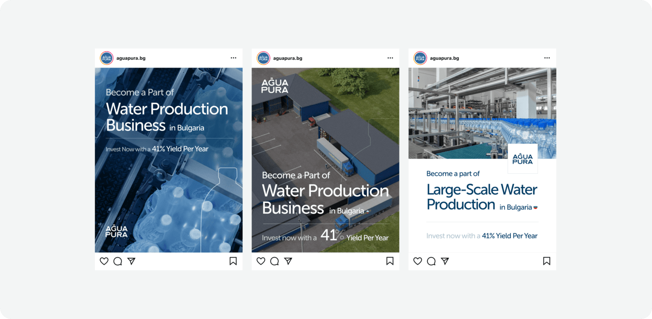 Анализ показал: на рынке есть компании, которые делают ставку либо на продукт, либо на производство. Agua Pura объединяет оба направления. Мы поняли, что важно показать масштаб производства, экологичность и ценность продукта одновременно.