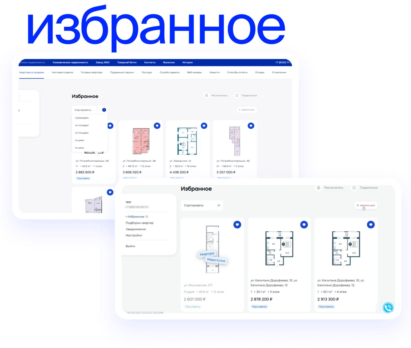 В разделе «Избранное» предусмотрена удобная сортировка по площади и цене.