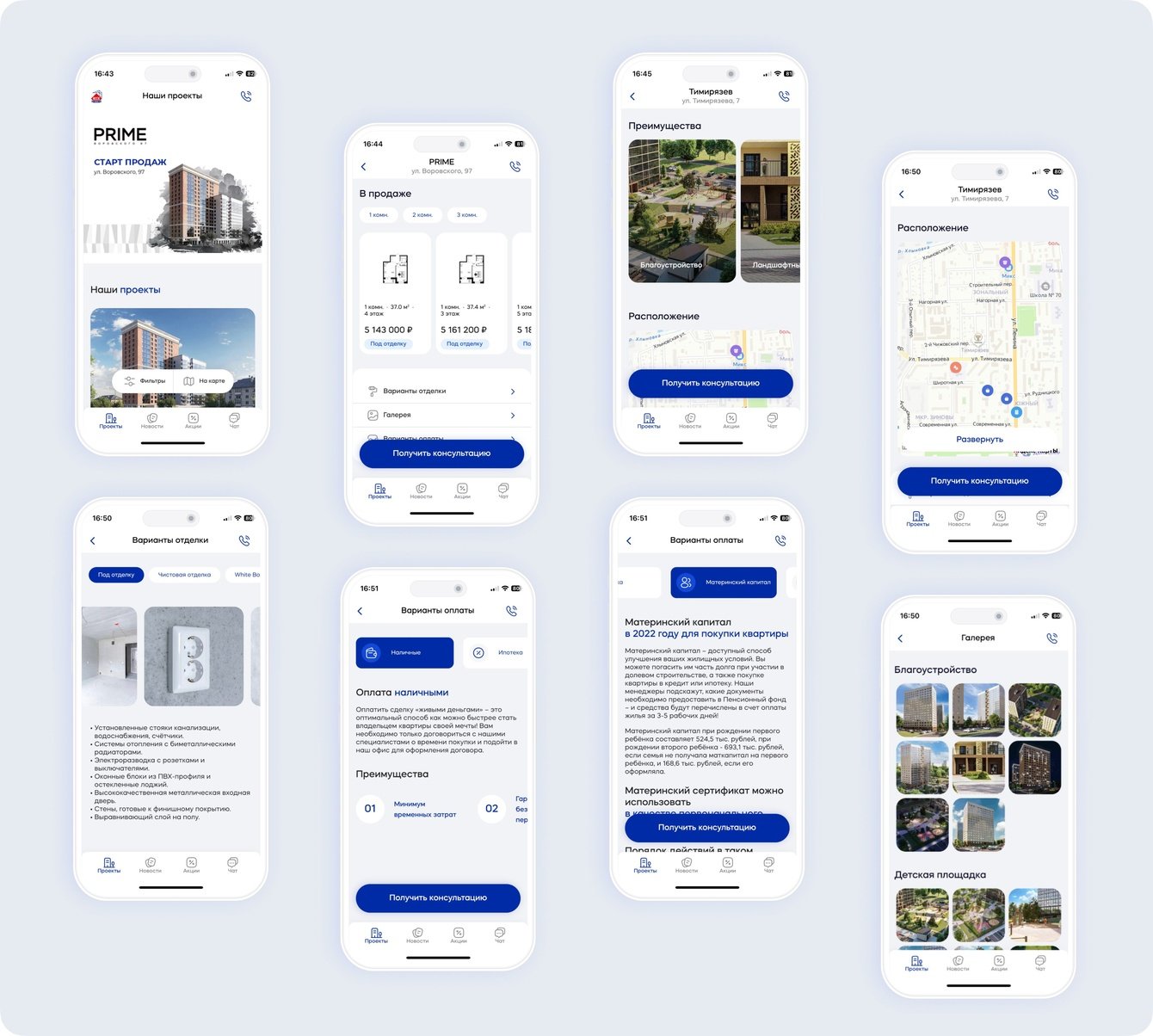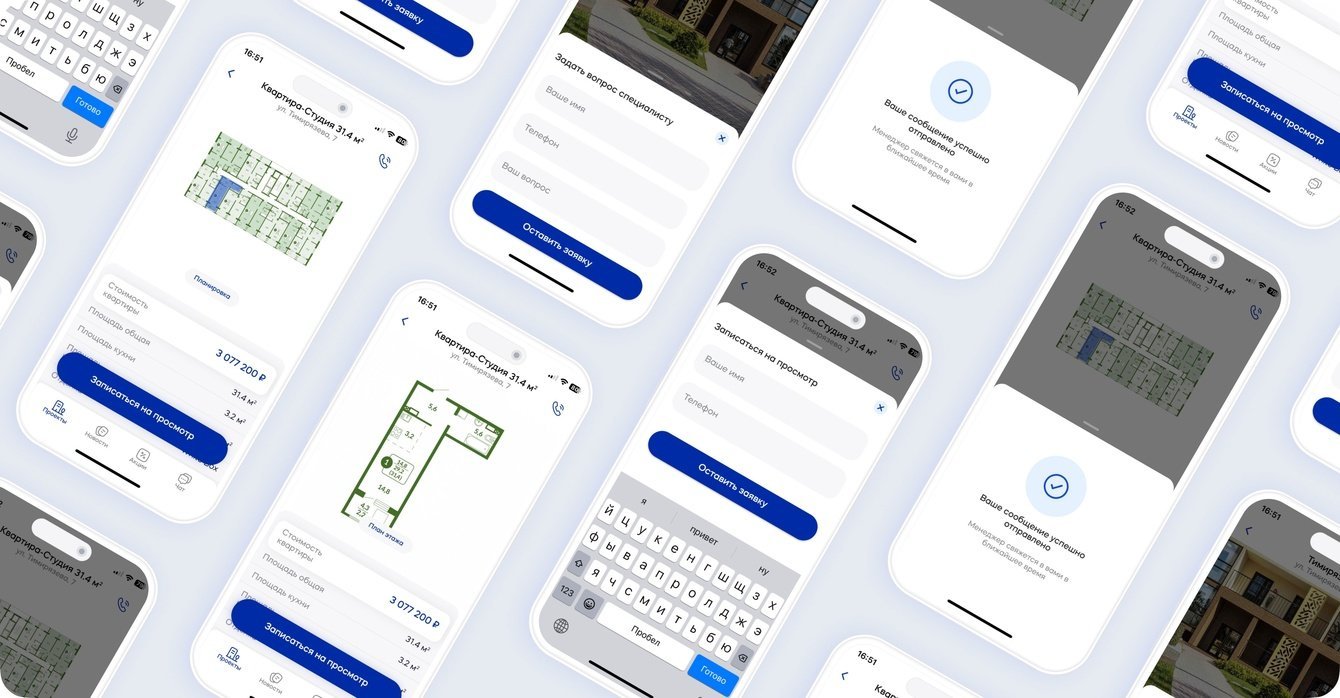 В приложении есть актуальная информация о вариантах оплаты, планировках, размерах и возможность отправить запрос на консультацию. Меню содержит раздел с новостями, чат с менеджером, созданный через интеграцию с CRM.
