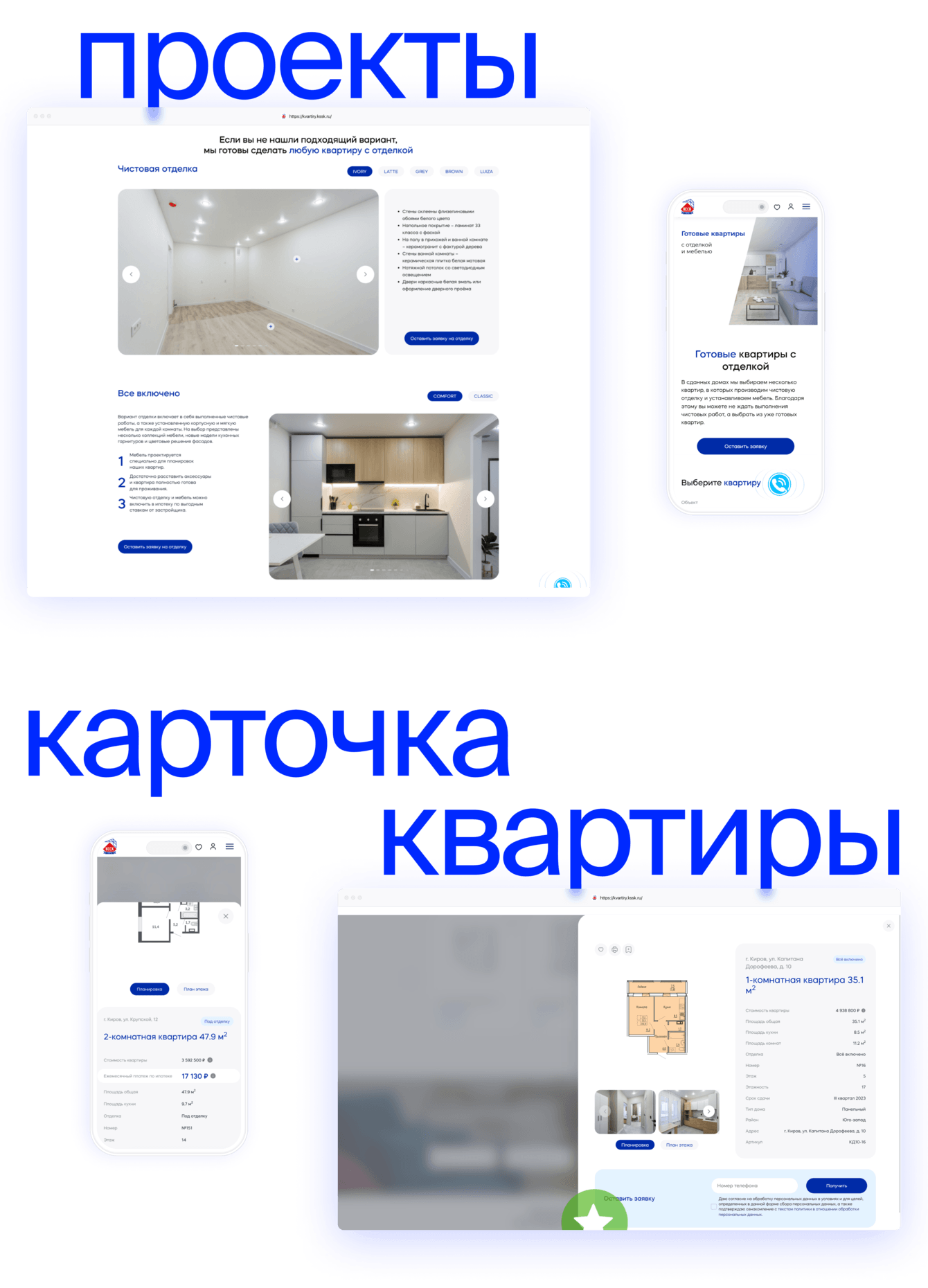 На главном экране представлен каталог проектов с баннерами, фильтром и картой объектов. Пользователь может выбрать недвижимость по параметрам и попасть на страницу объекта через карту. В нем доступны характеристики объектов, фильтр по квартирам, преимущества, фотографии и информация о строительстве.