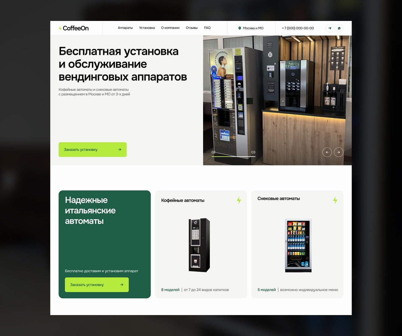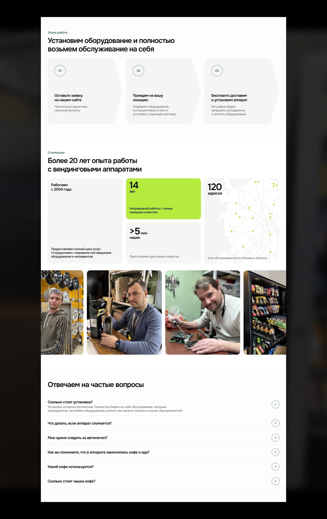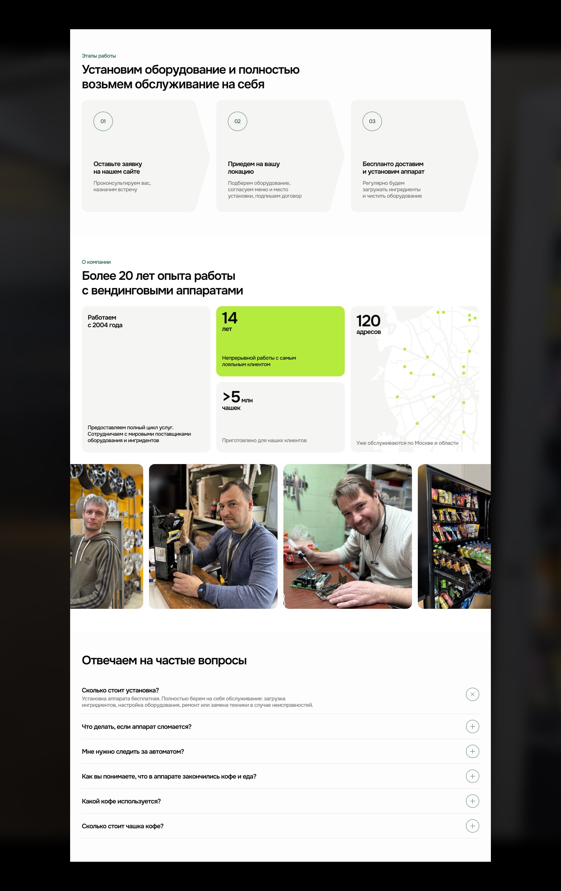 Первый экран сразу закрывает ключевые возражения: стоимость установки, обслуживания и срок размещения. С помощью слайдера показали реально установленные аппараты, чтобы человек сразу мог не только прочитать про продукт, но и увидеть его.