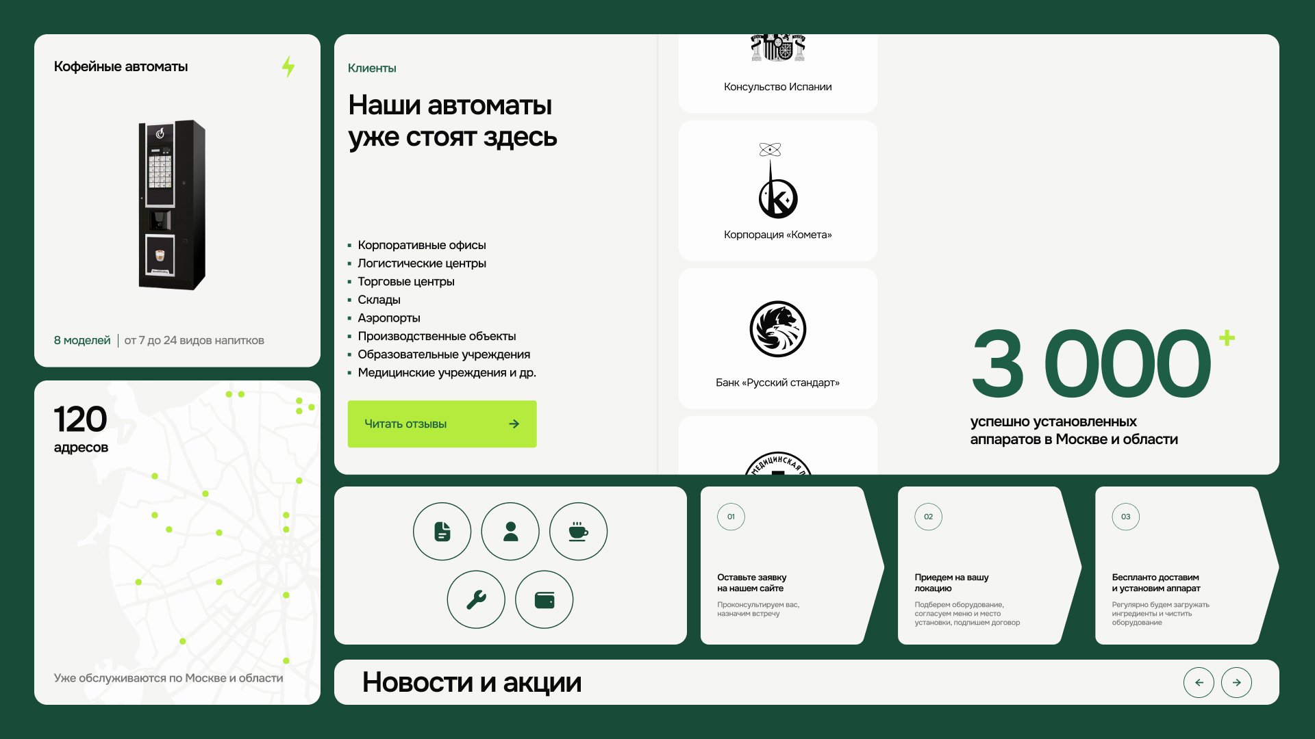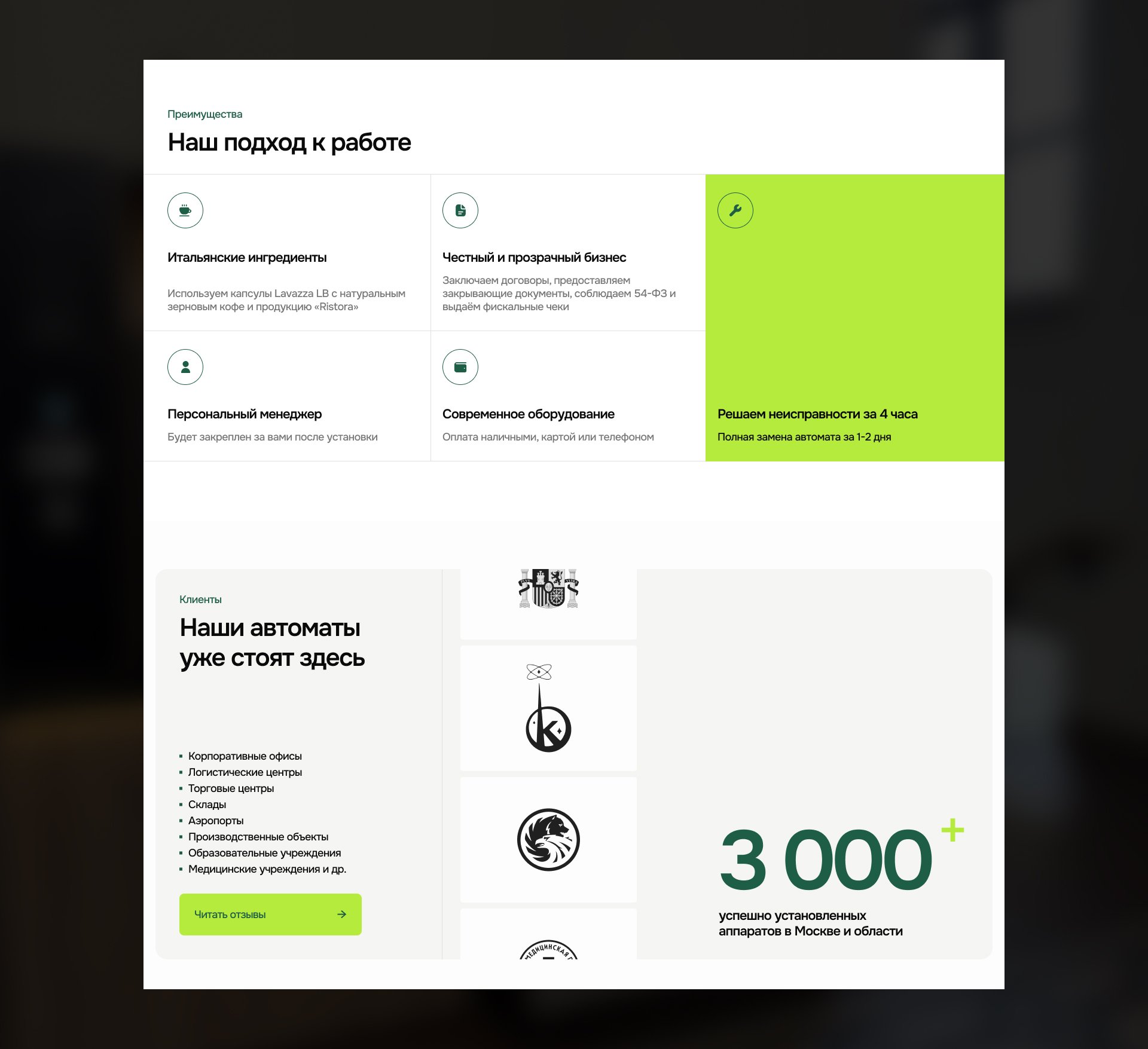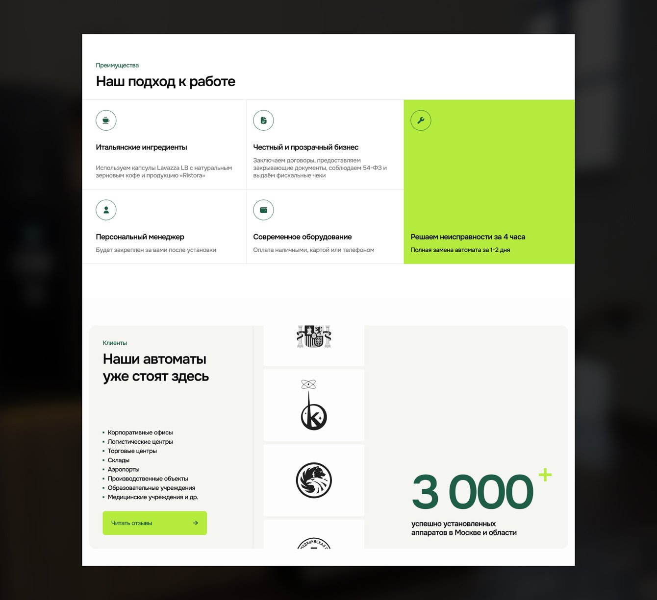 Доверие выстраивали через логотипы клиентов, количество и фотографии установленных аппаратов в Москве и МО, отзывы. Фотографии решают конкретную задачу — пользователь видит реальные размеры, варианты наполнения и понимает, что подходит под его цели.