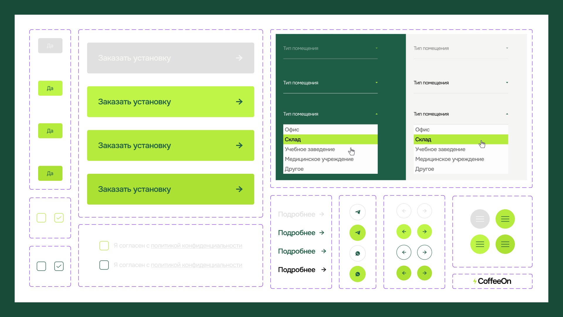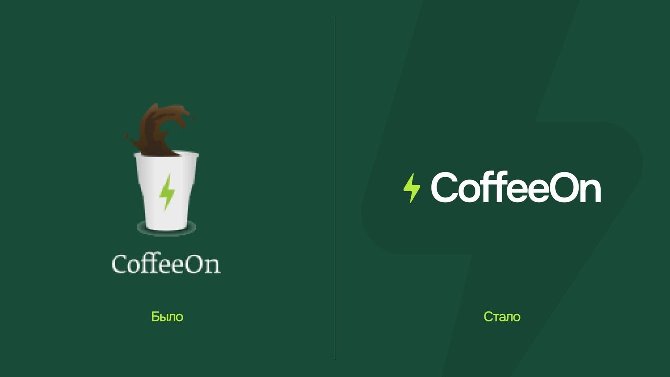 Поэтому добавили темно-зеленый как балансирующий: он придает сдержанности и контраста, не исключая при этом посыл основного цвета. Это важно, поскольку Coffee On работает как с малым бизнесом, так и с крупным, необходимо, чтобы визуал считывался уместно для обеих аудиторий.