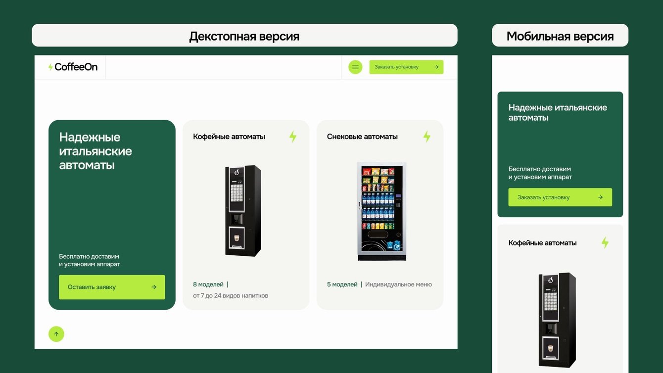 Отдельно проработали мобильную версию. Мы сознательно отказались от идеи спрятать вендинговые аппараты в горизонтальный скролл на мобильной версии. Вместо этого показали их последовательно, чтобы ничего не терялось и не оставалось незамеченным.