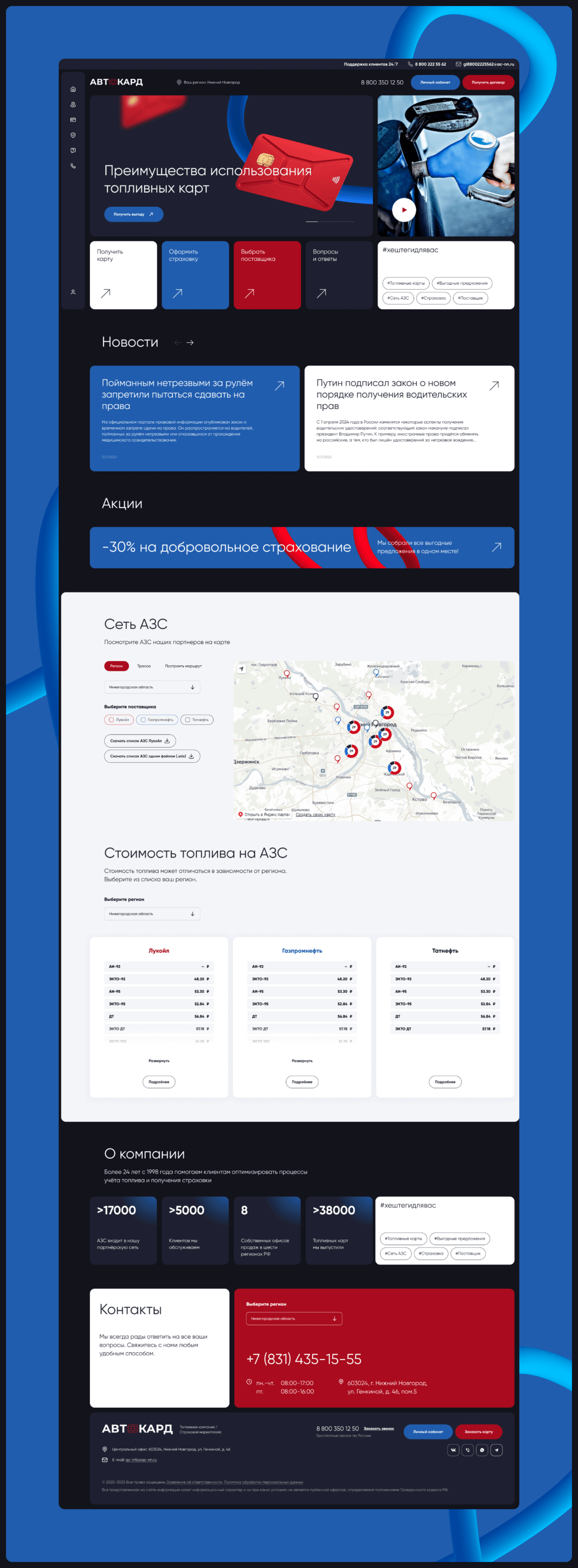 Компания АВТОКАРД более 24 лет занимается оформлением топливных карт для юридических лиц и ИП. Обслуживает более 5 000 клиентов, в партнерскую сеть АВТОКАРДА входит более 17 000 АЗС.