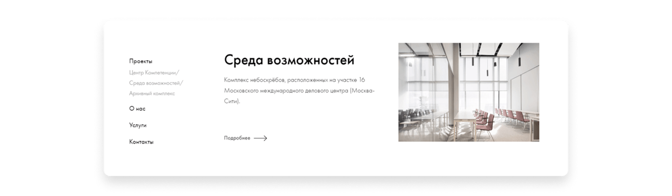 — Сделали акцент на первых экранах: теперь можно сразу перейти к детальному описанию услуг. Это решение обусловлено поведением целевой аудитории и её запросом. В этой нише компании редко заполняют формы для обратной связи, предпочитая связываться по электронной почте. Навигация на сайте подталкивает действовать по привычному паттерну: просмотрел услуги или проекты, затем написал запрос или приглашение в тендер по электронной почте. Классическая форма заявки на сайте тоже есть, но не является приоритетной.
