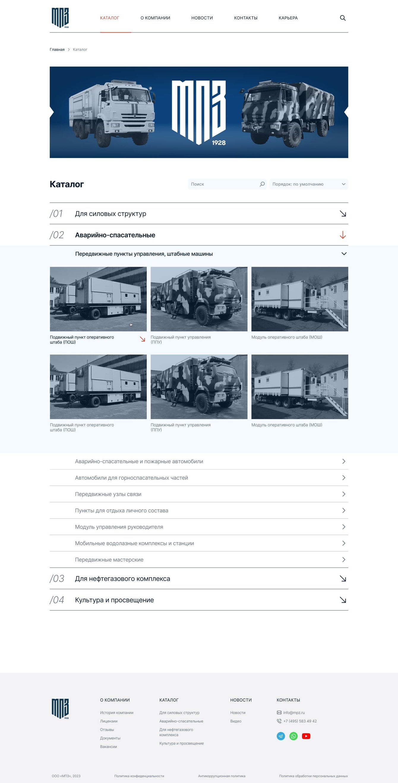 Структурирование каталога: Каталог продукции был разделен на логические категории: "Аварийно-спасательные", "Для силовых структур", "Для нефтегазового комплекса", "Культура и просвещение". Это позволило упростить навигацию и сделать поиск нужной информации более интуитивно понятным.