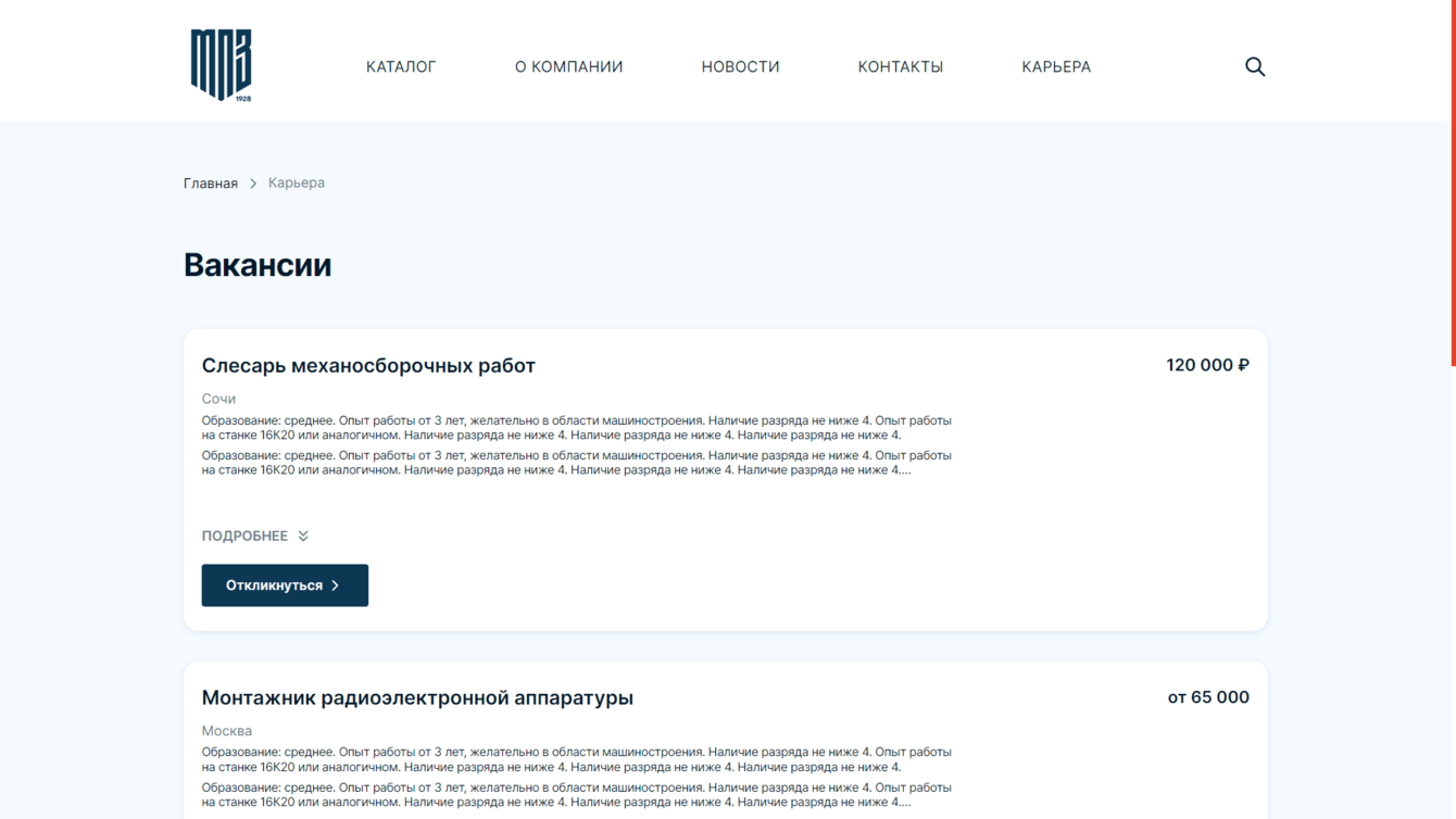 Страница вакансий была переработана для упрощения навигации и улучшения визуального восприятия. Яркое оформление и удобная структура создают лучшее представление о рабочей среде и культуре завода, подчеркивая его профессионализм и открытость.