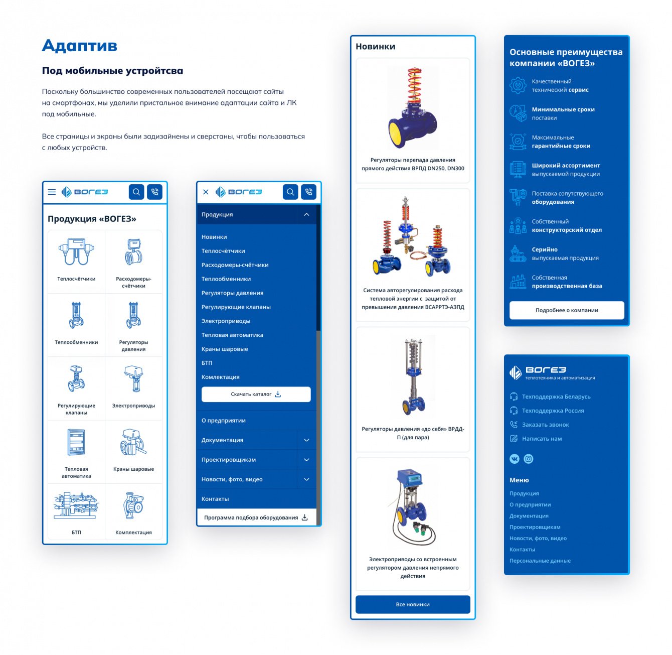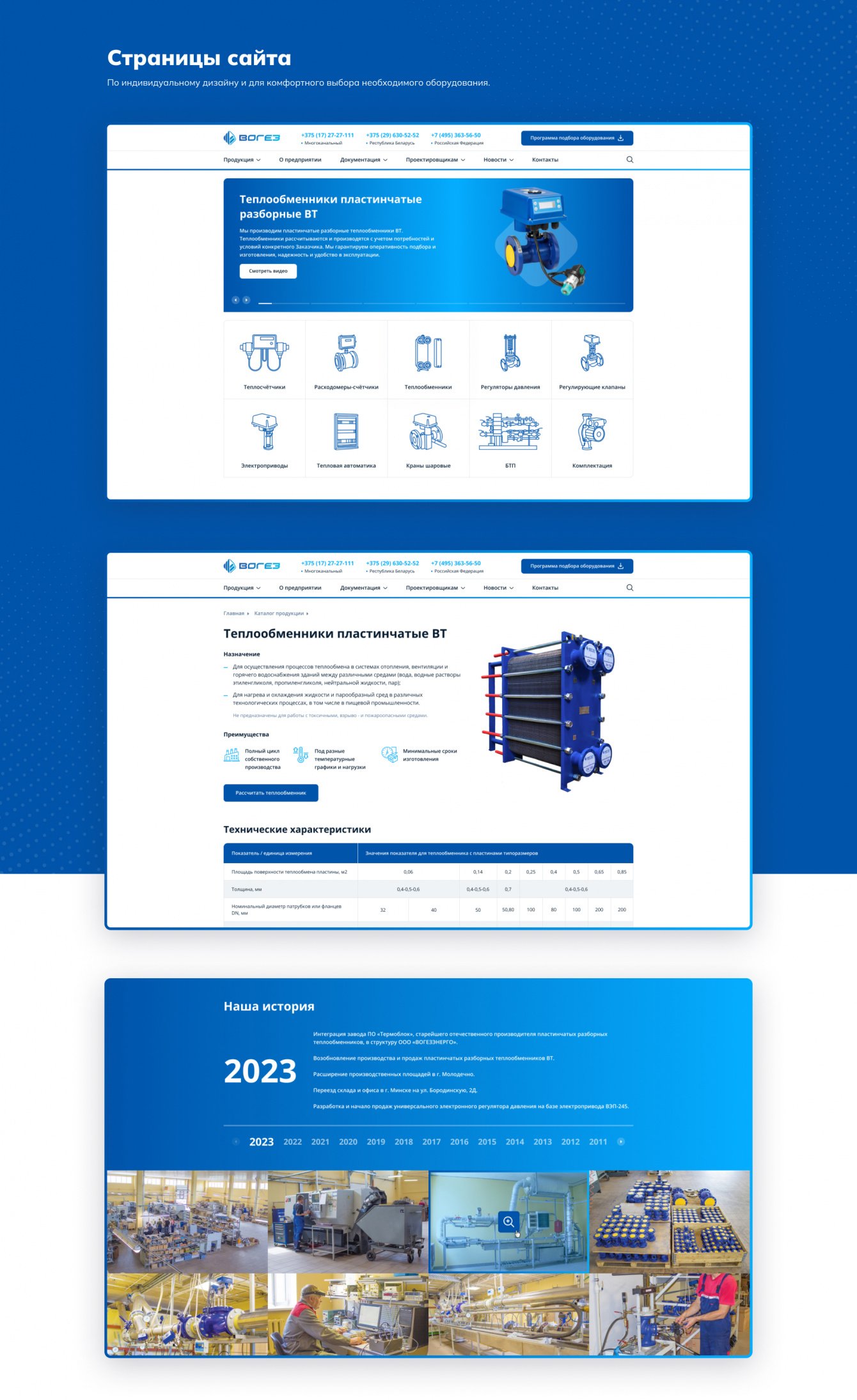 Удобно расположили и показали контактные данные отделов и технической поддержки компании в Беларуси, России, Казахстане и Узбекистане. Добавили целевые лендинги для продвижения самого важного оборудования.