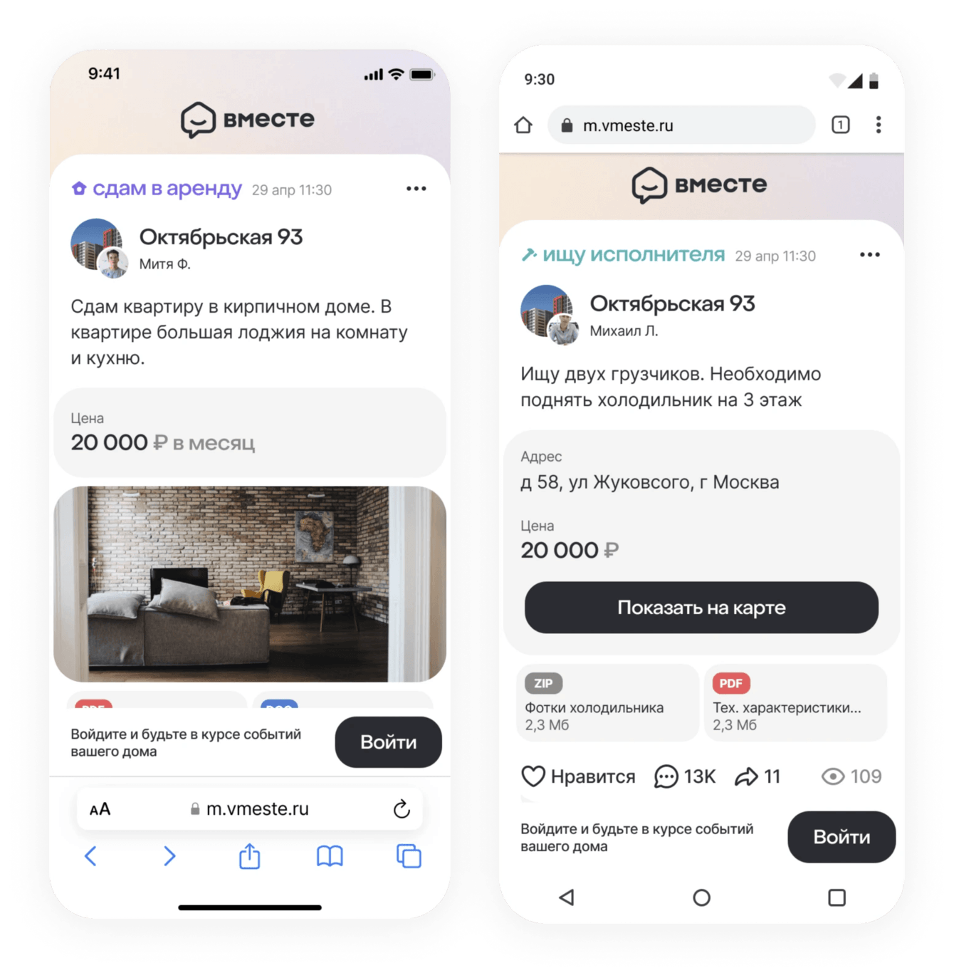 Проект Вместе.ру появился в 2017 году и за время своего существования претерпел несколько концептуальных изменений. Сейчас это социальная сеть для соседей, позволяющая людям объединяться по месту проживания: дому, улице, кварталу, району. Включает в себя как функционал для жителей – чаты, новости, сообщества, доски объявлений, барахолку, – так и для управляющих компаний и бизнесов, позволяющий предлагать этим жителям услуги.
