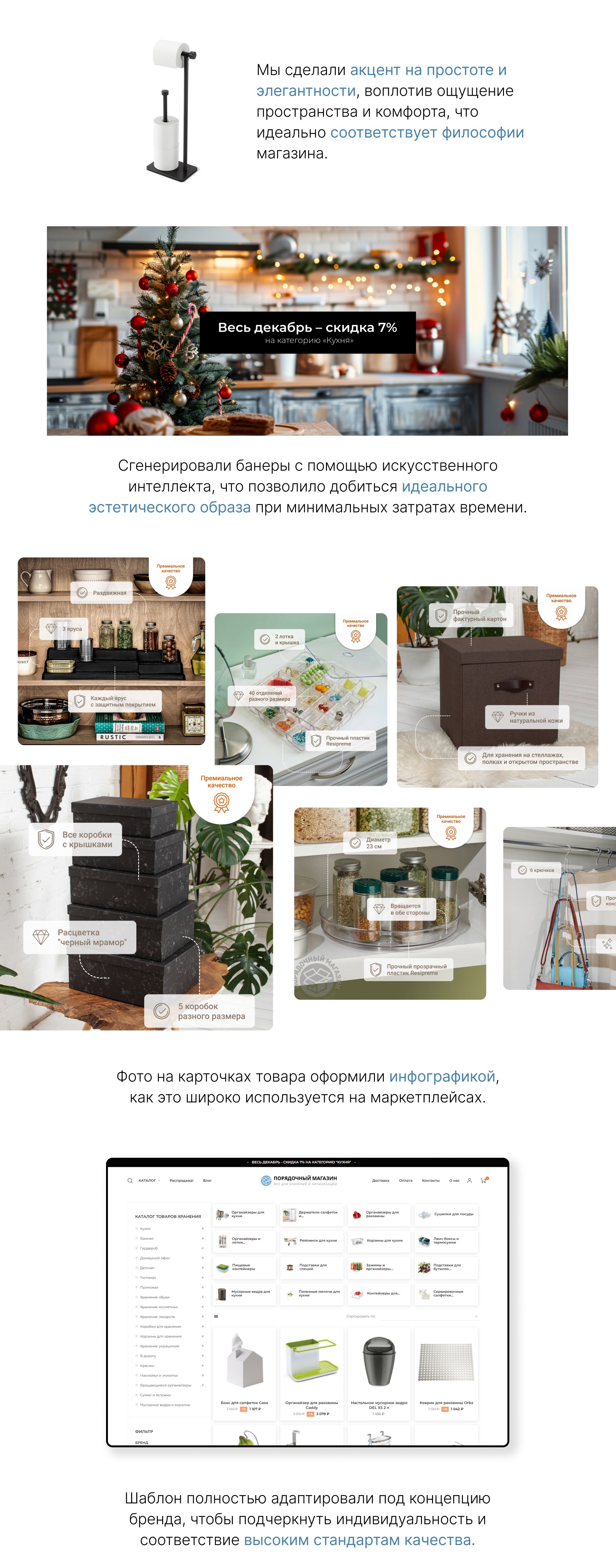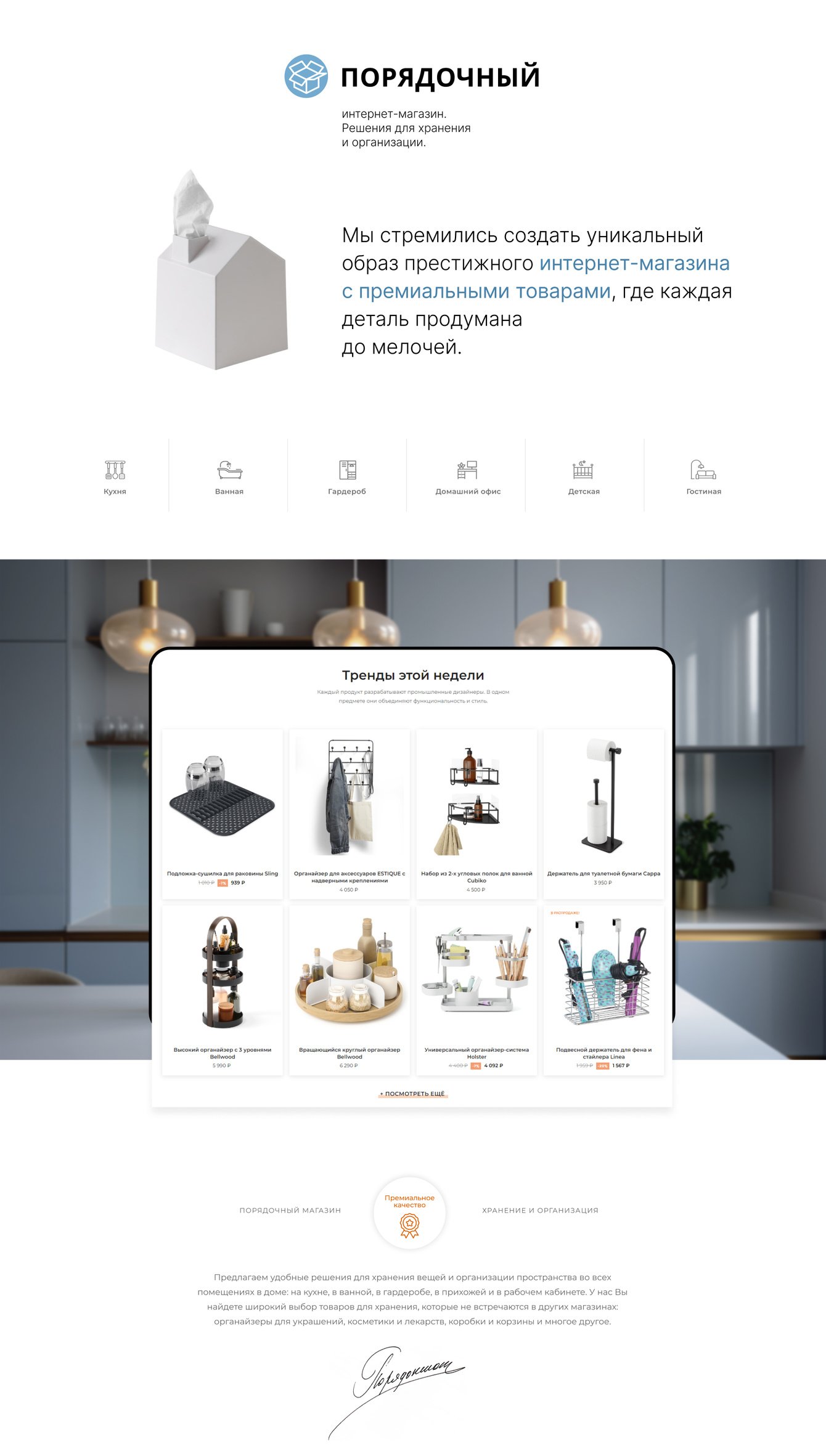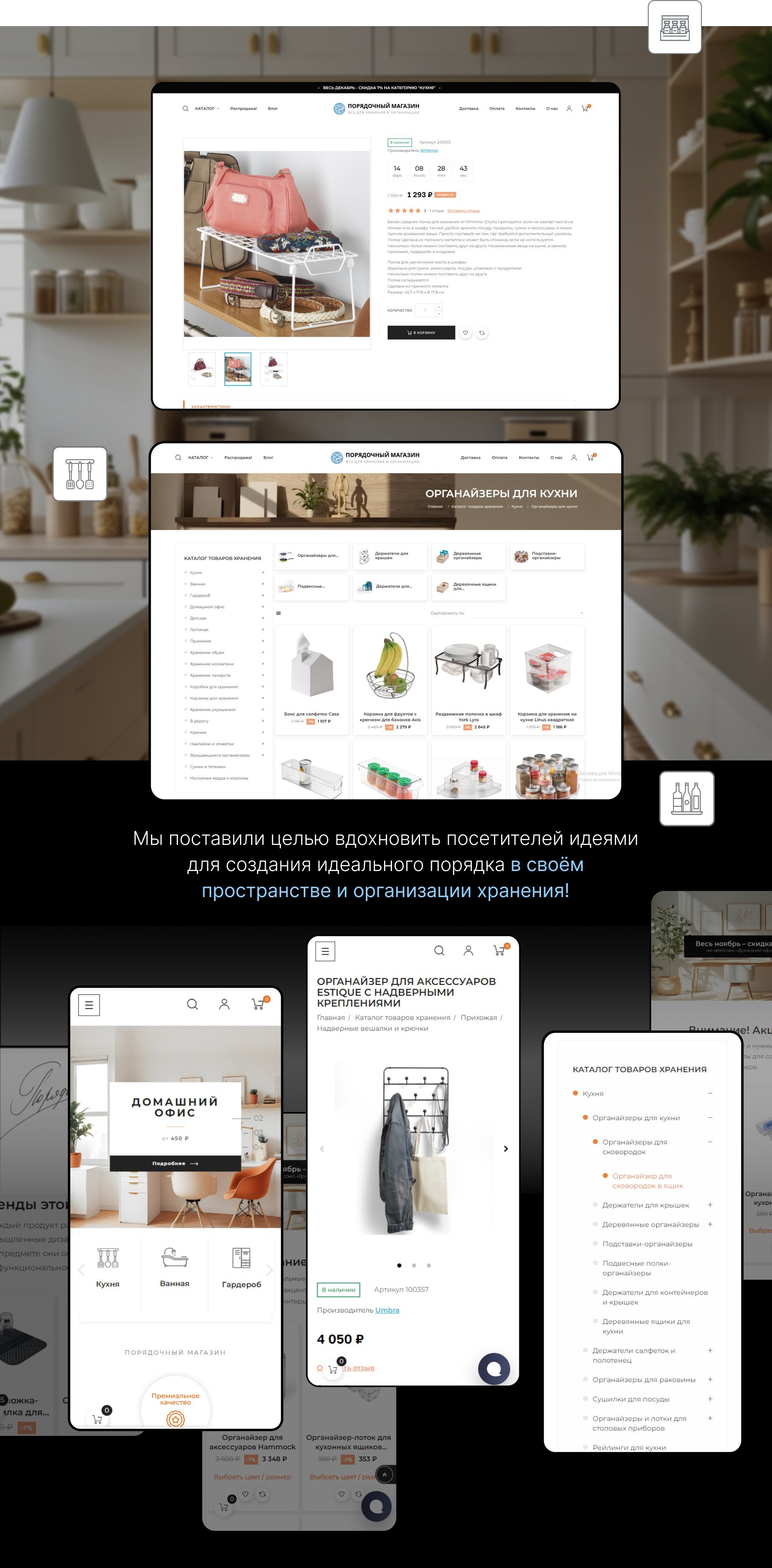 Мы подчеркнули индивидуальность бренда и его соответствие высоким стандартам качества. Главная цель достигнута: посетители могут не только выбирать товары, но и вдохновляться идеями для создания идеального порядка в своем пространстве.