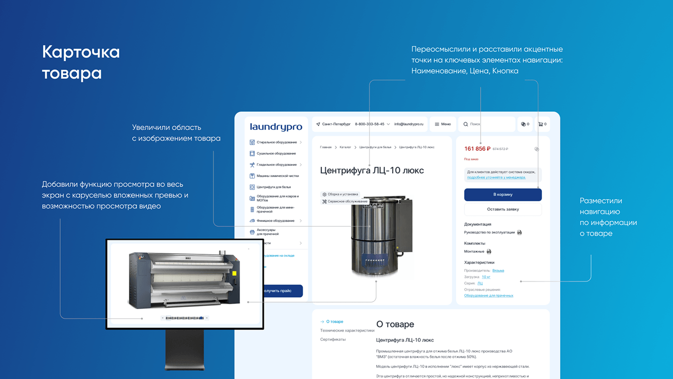 2. Упростили информацию о товаре на странице товара: пересобрали первый экран и добавили навигацию, чтобы пользователи легко ориентировались в деталях о товаре, минимизируя усилия на изучение информации.