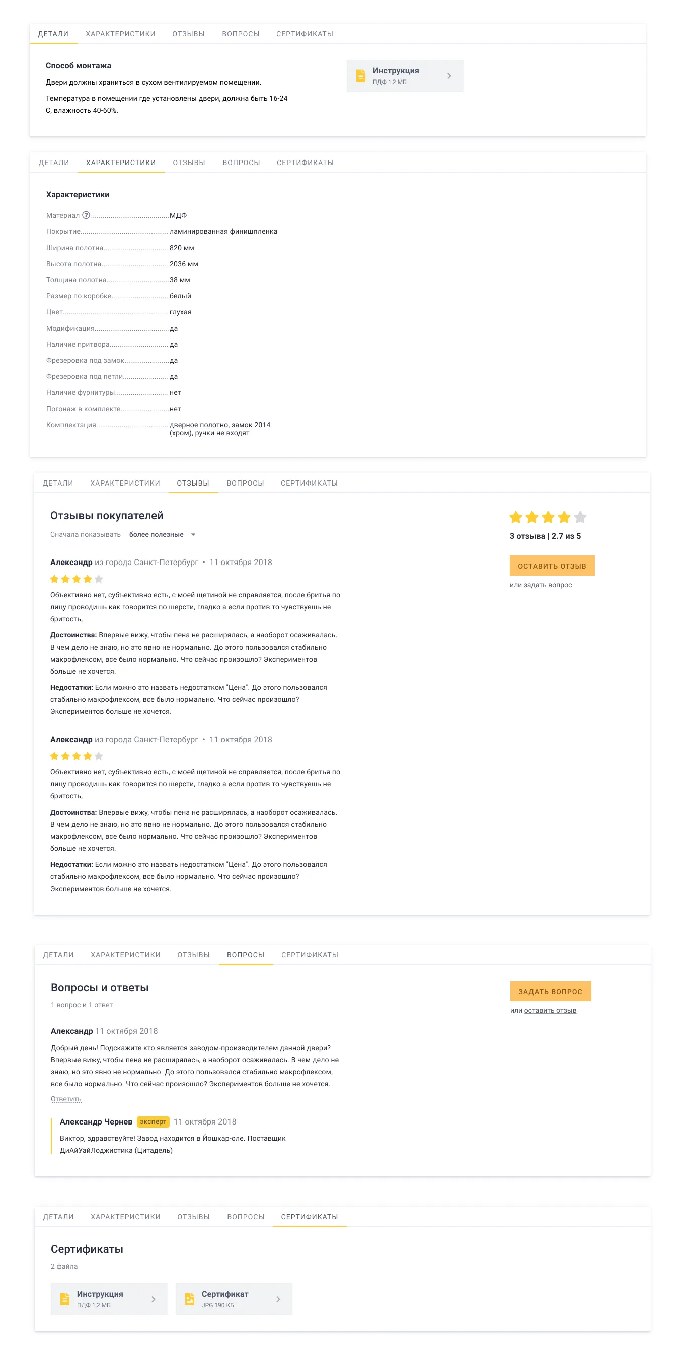 Переделали блок с табами в нижней части страницы: «Детали» (объемный и не вполне читабельный текст), «Вопросы» и «Отзывы». Для отзывов и вопросов раньше использовали стандартный плагин, визуально они выбивались и из старого дизайна, и из нового.