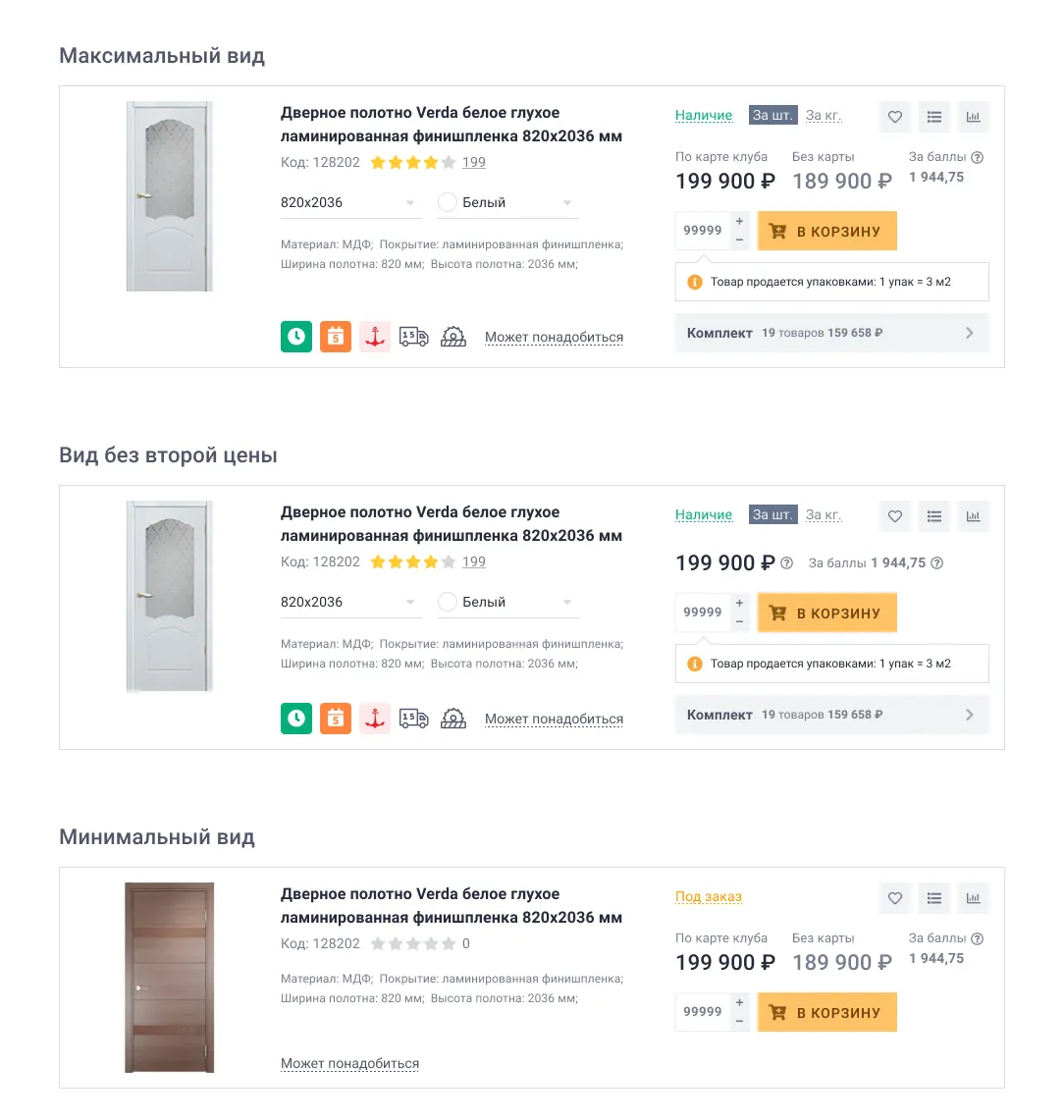 Одно из принципиальных решений заказчика — показывать в мини-карточках все важные сущности товара: варианты цены, акции, условия, комплекты.