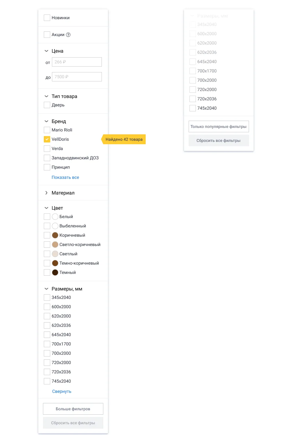 Задачи были вот такие: «Представление и механика фильтров в целом», «Блок фильтра товаров с возможностью скрыть непопулярные фильтры», «Тултипы для всплывающих подсказок в списке фильтров», «Графические элементы в фильтрах».