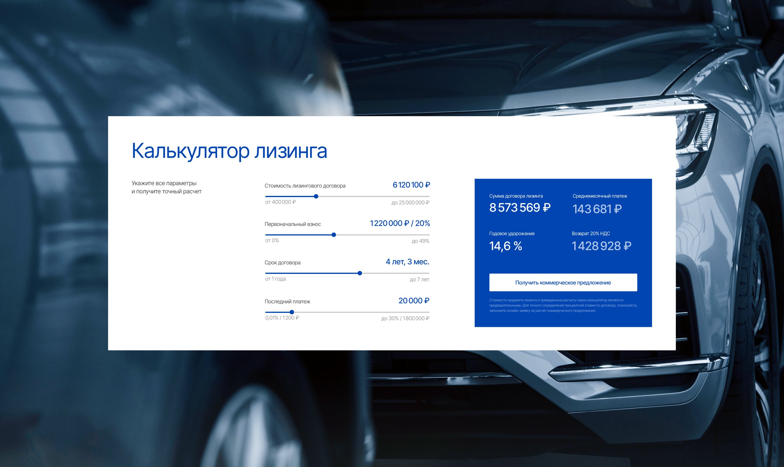 Калькулятор — один из самых важных элементов сайта. Он позволяет пользователям быстро и удобно рассчитывать условия лизинга, получая точную информацию о сумме договора лизинга, ежемесячном платеже, годовом удорожании и сумме возврата НДС.
