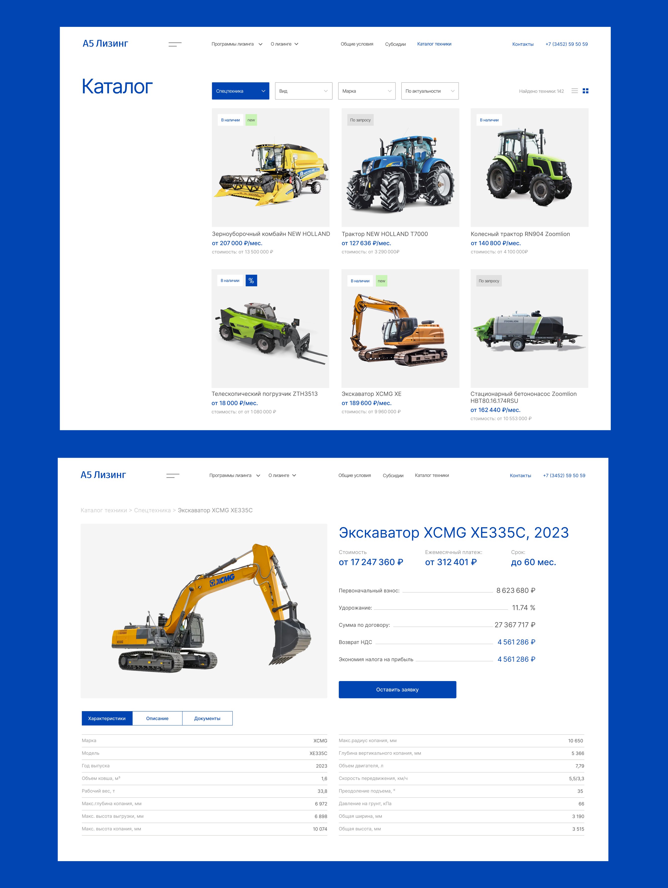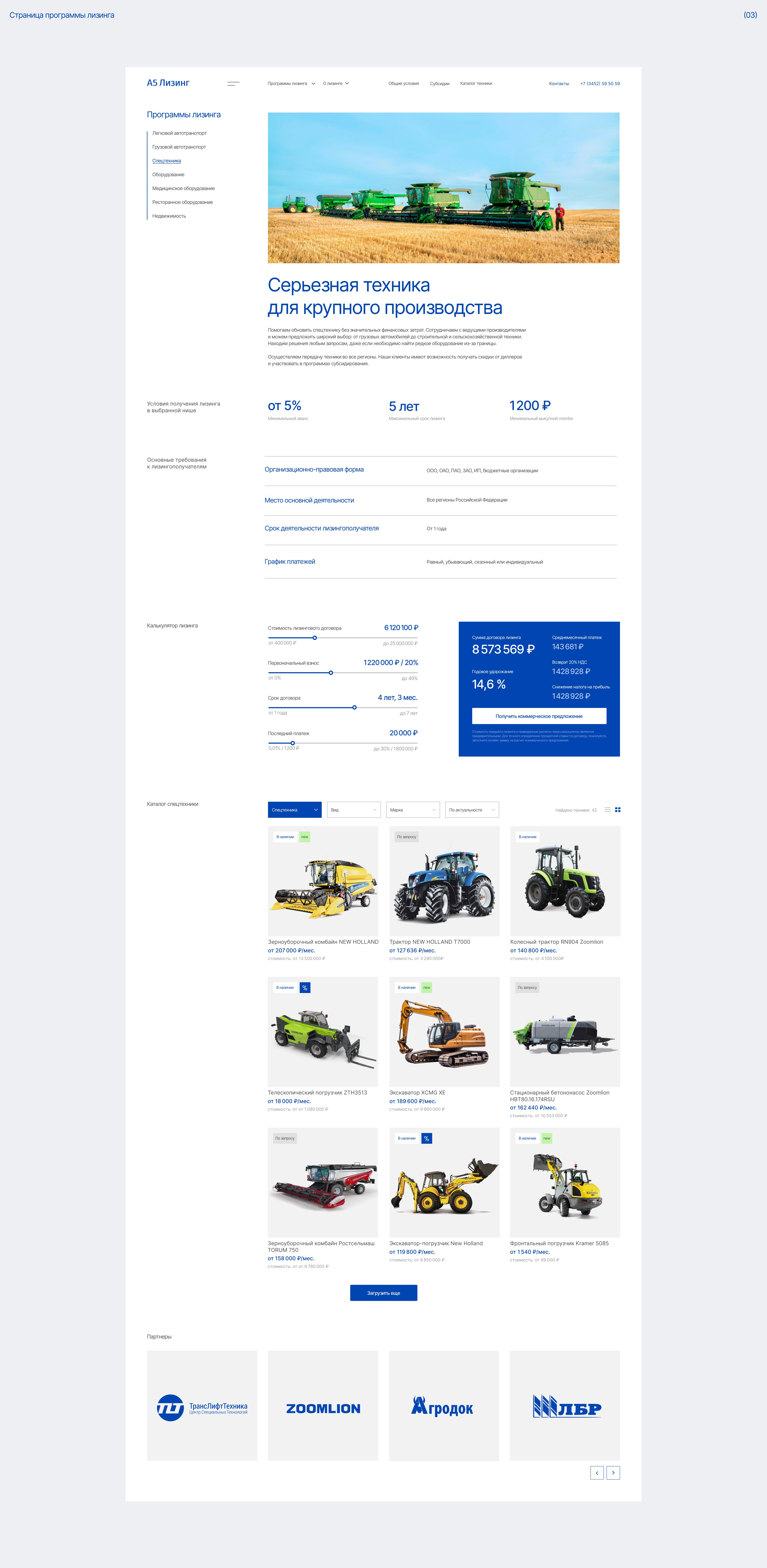 Разработали для каждого направления лизинга отдельную страницу с информацией об условиях лизинга, требованиях к лизингополучателям и каталогом техники. Такое решение позволяет оптимизировать SЕО, снизить расход на контекстную рекламу и вести потенциального клиента сразу на интересующее его направление или технику.