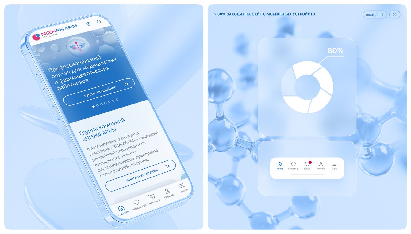 Особенностью проекта стал функционал, уникальный для фармкомпаний: полноценный интернет-магазин, встроенный в сайт nizhpharm.ru. Пользователь выбирает товары, применяет промокоды, формирует корзину и проходит все этапы оформления внутри сайта производителя. После оформления заказа данные передаются в партнерскую систему, где формируется заказ и направляется в выбранную пользователем аптеку для получения и оплаты, при этом для пользователя путь выглядит единым в рамках одного сайта.