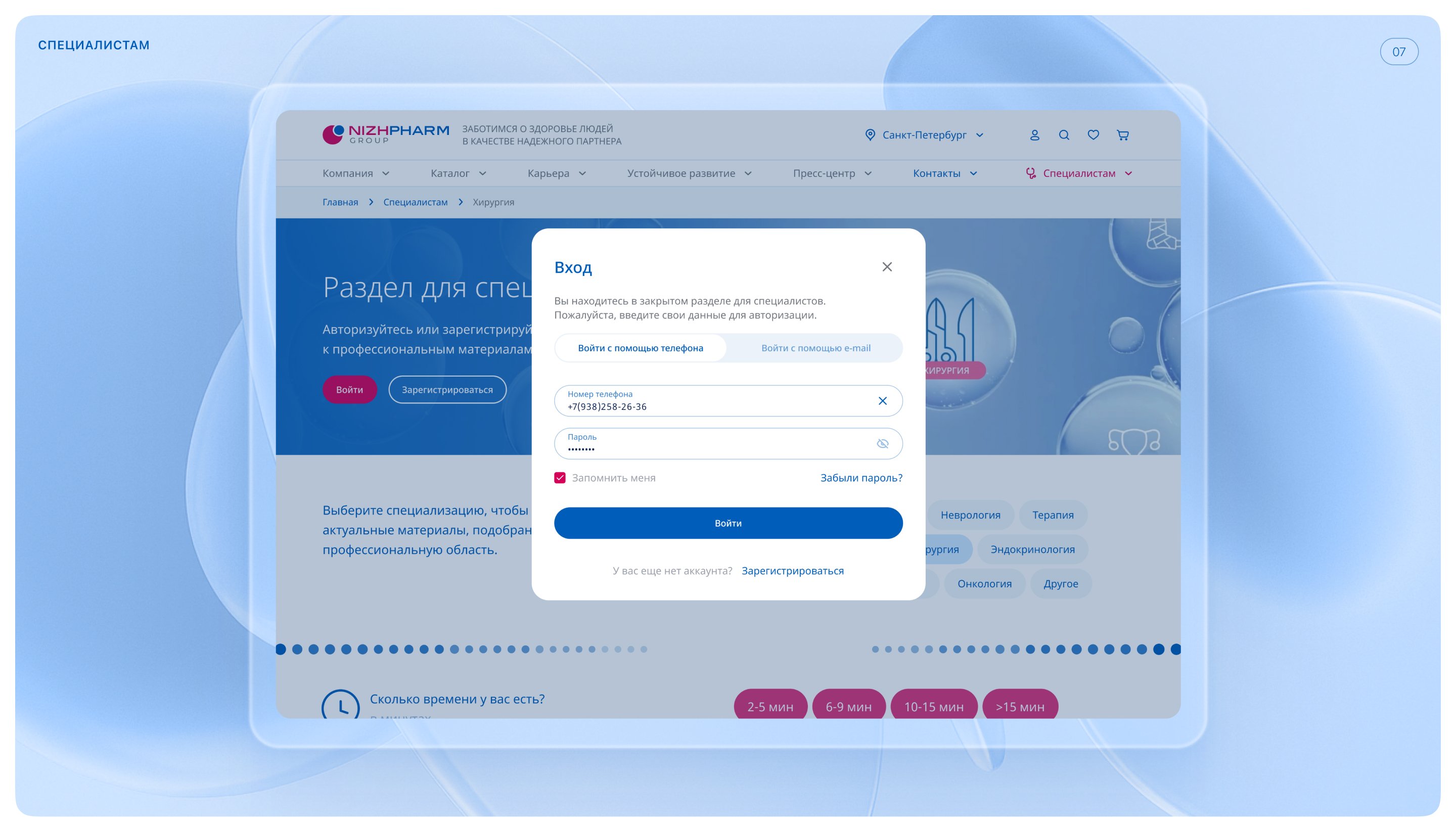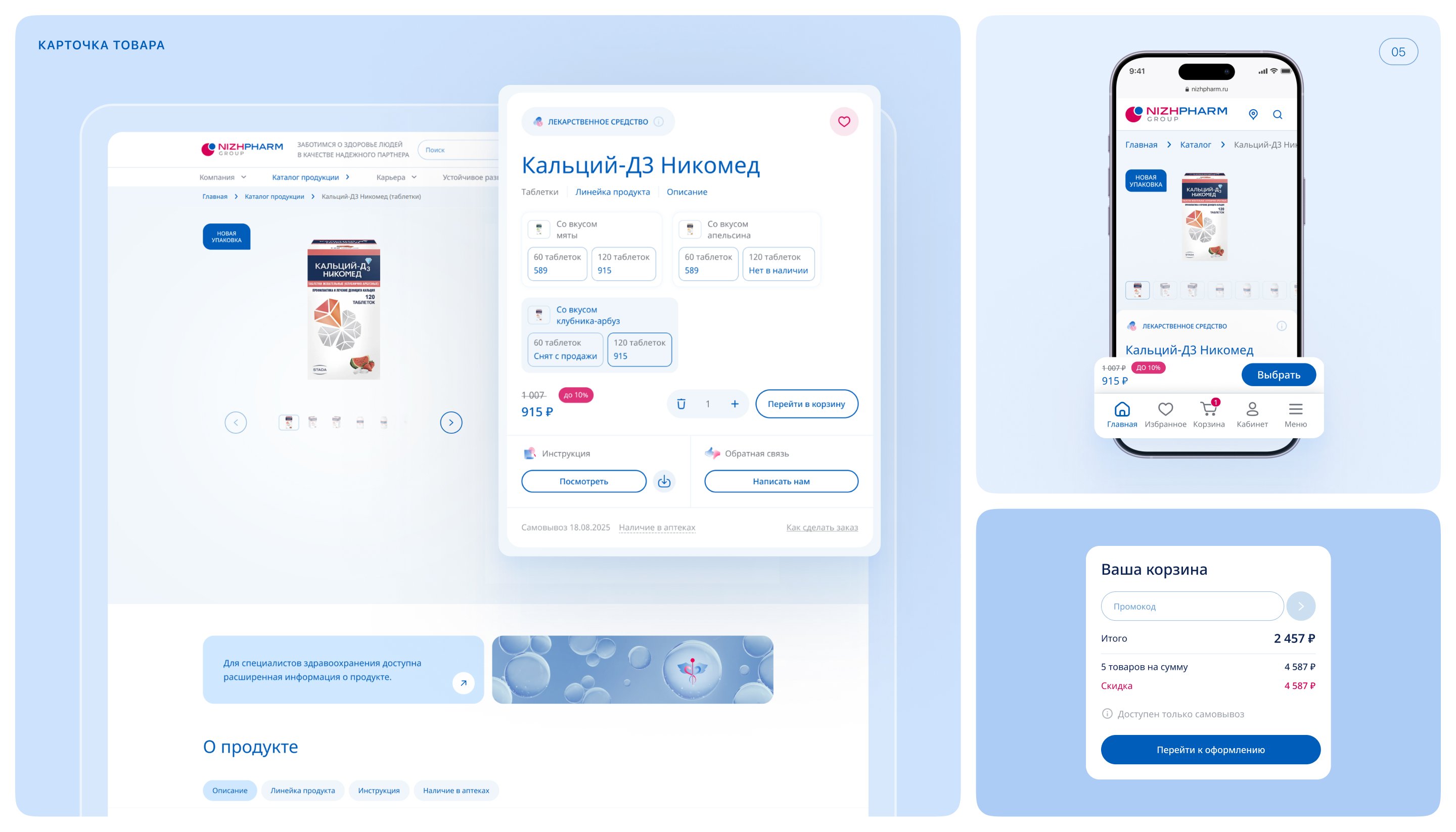 Особенностью проекта стал функционал, уникальный для фармкомпаний: полноценный интернет-магазин, встроенный в сайт nizhpharm.ru. Пользователь выбирает товары, применяет промокоды, формирует корзину и проходит все этапы оформления внутри сайта производителя. После оформления заказа данные передаются в партнерскую систему, где формируется заказ и направляется в выбранную пользователем аптеку для получения и оплаты, при этом для пользователя путь выглядит единым в рамках одного сайта.