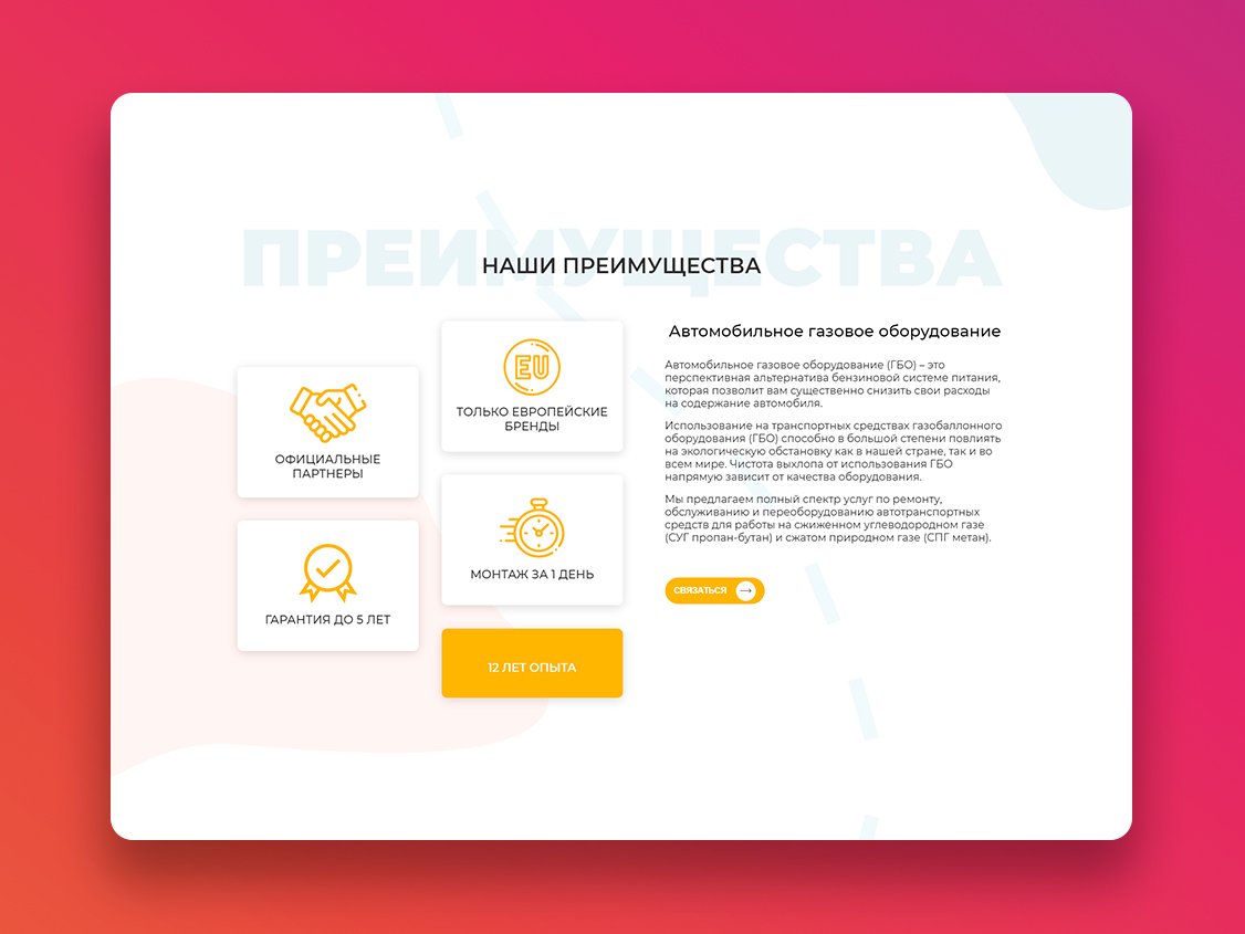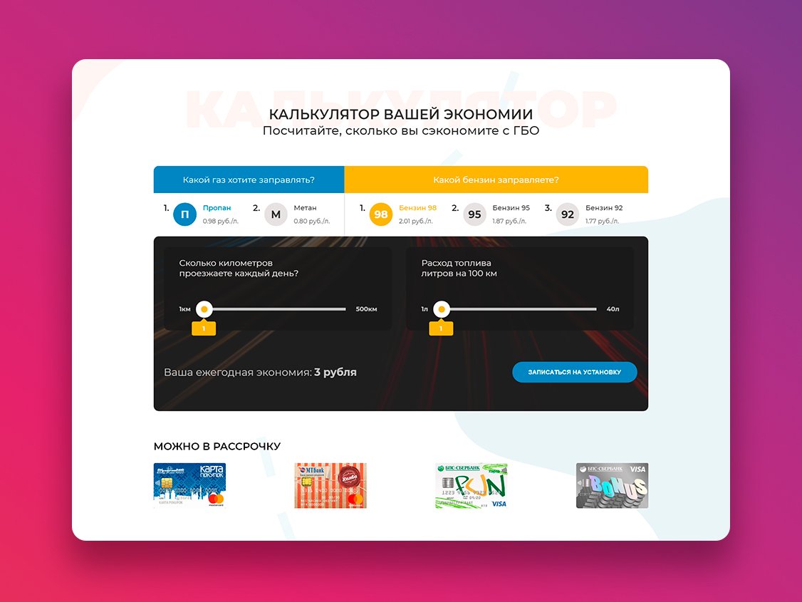 У нас получился адаптивный одностраничник с анимацией, параллаксом и калькулятором экономии. После работы над калькулятором вся наша команда задумалась об установке газа в свои автомобили, попробуйте, Вы офигеете от экономии.