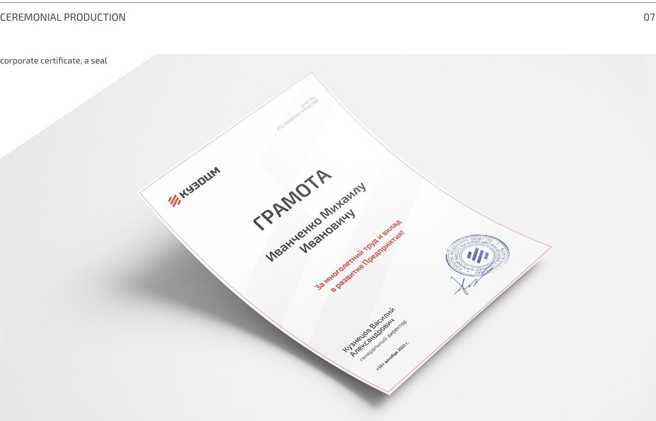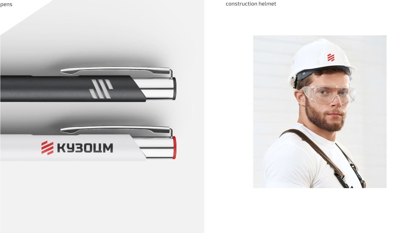 Завод еще только внедряет новую систему визуальных коммуникаций в свою работу. На производственной площадке размещены навигационные баннеры, изготовлены новые флаги, персонал завода работает в брендированных робах, а для офиса генерального директора отшито новое знамя. Новую айдентику можно увидеть в VK kuzocm