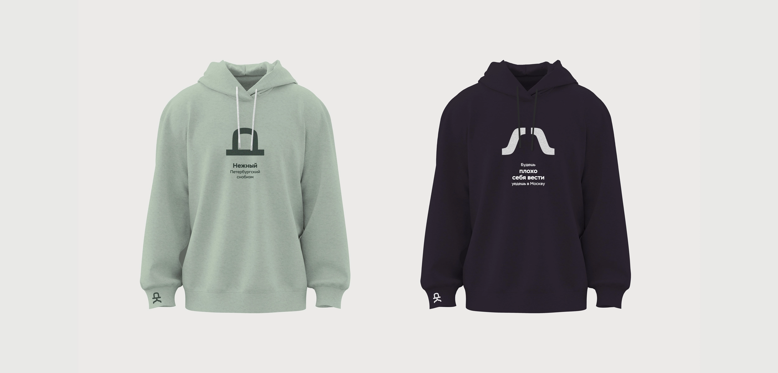 Так же клиенту была предложена хулиганская концепция, которая нам очень нравится и мы не смогли не выложить. Она вдохновлена иллюстрациями Александра Флоренского и живописью Владимира Шинкарева. Смешные питерские персонажи и символы, неправильные формы, плашки под текстом — как будто вылили банку чернил.