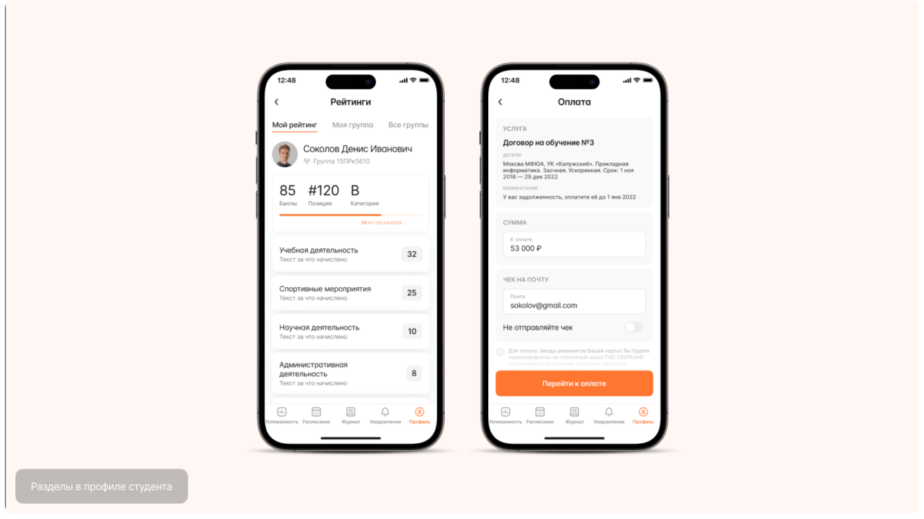 - Профиль: рейтинги студентов и групп, договоры, возможность оплаты и многое другое.