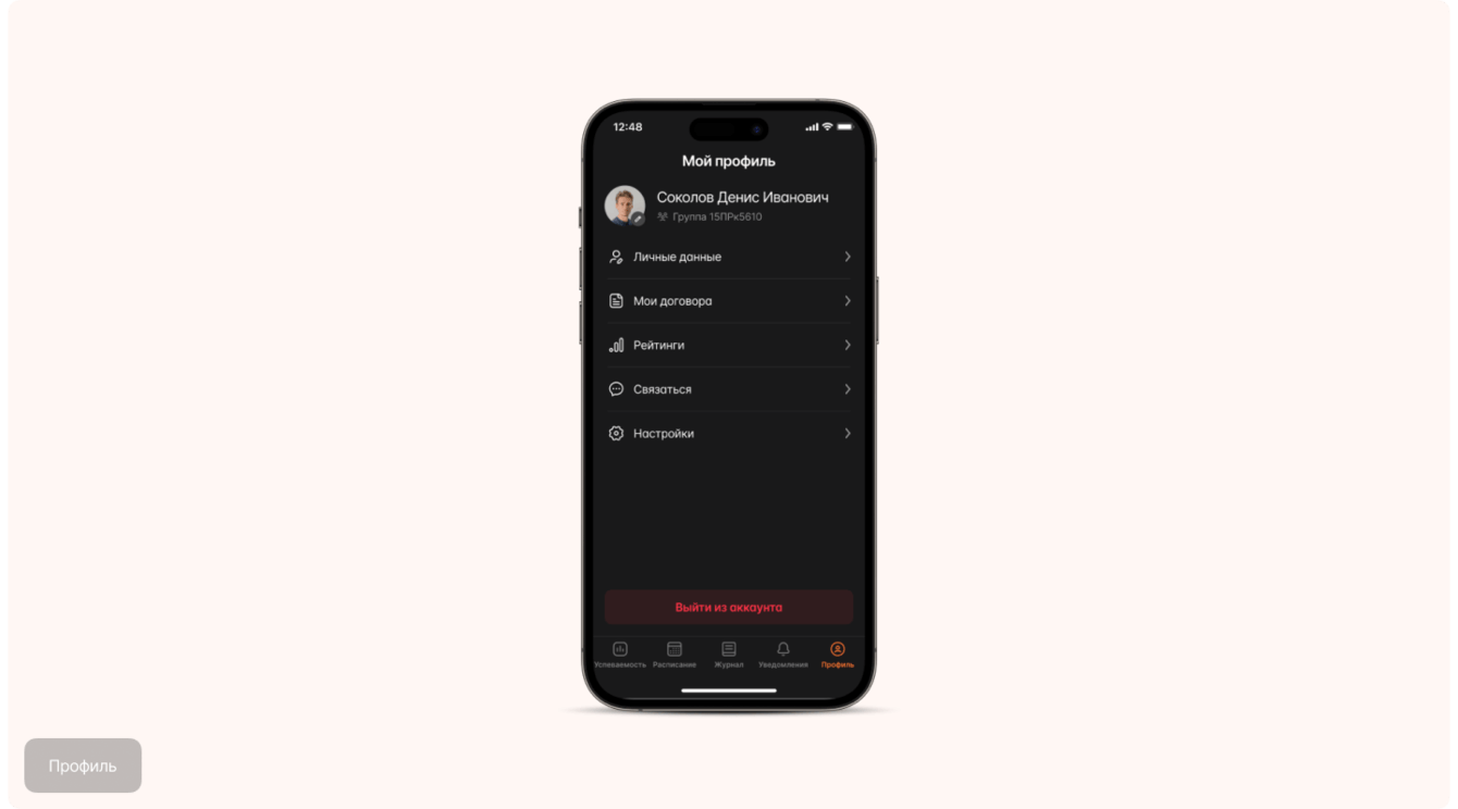 - Профиль: рейтинги студентов и групп, договоры, возможность оплаты и многое другое.