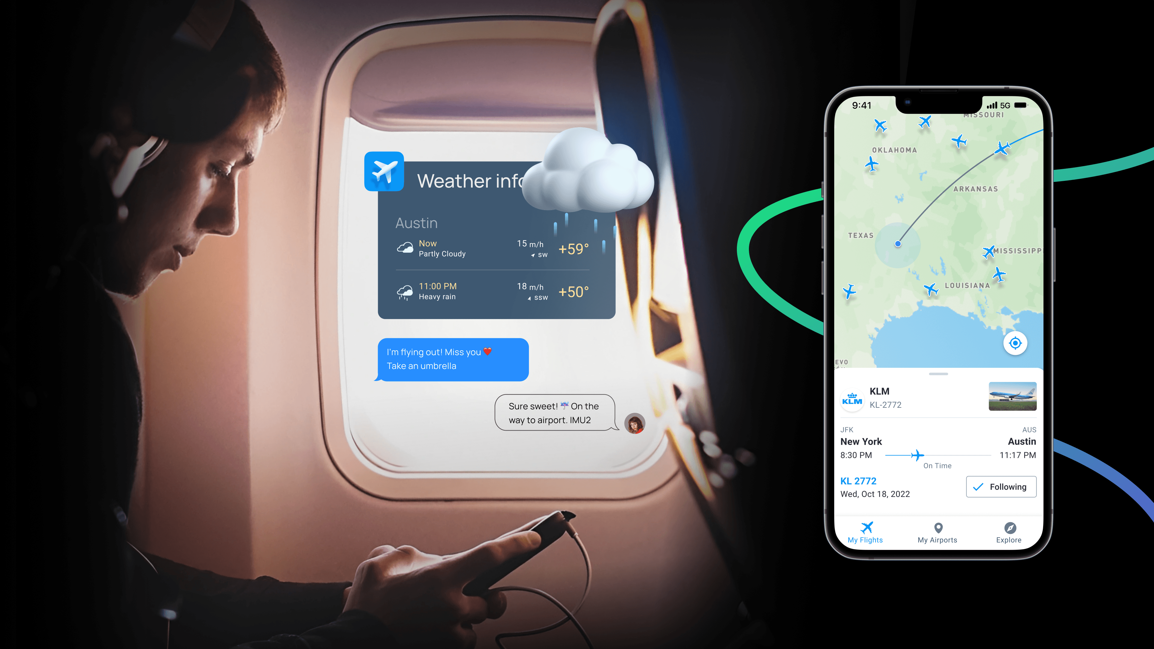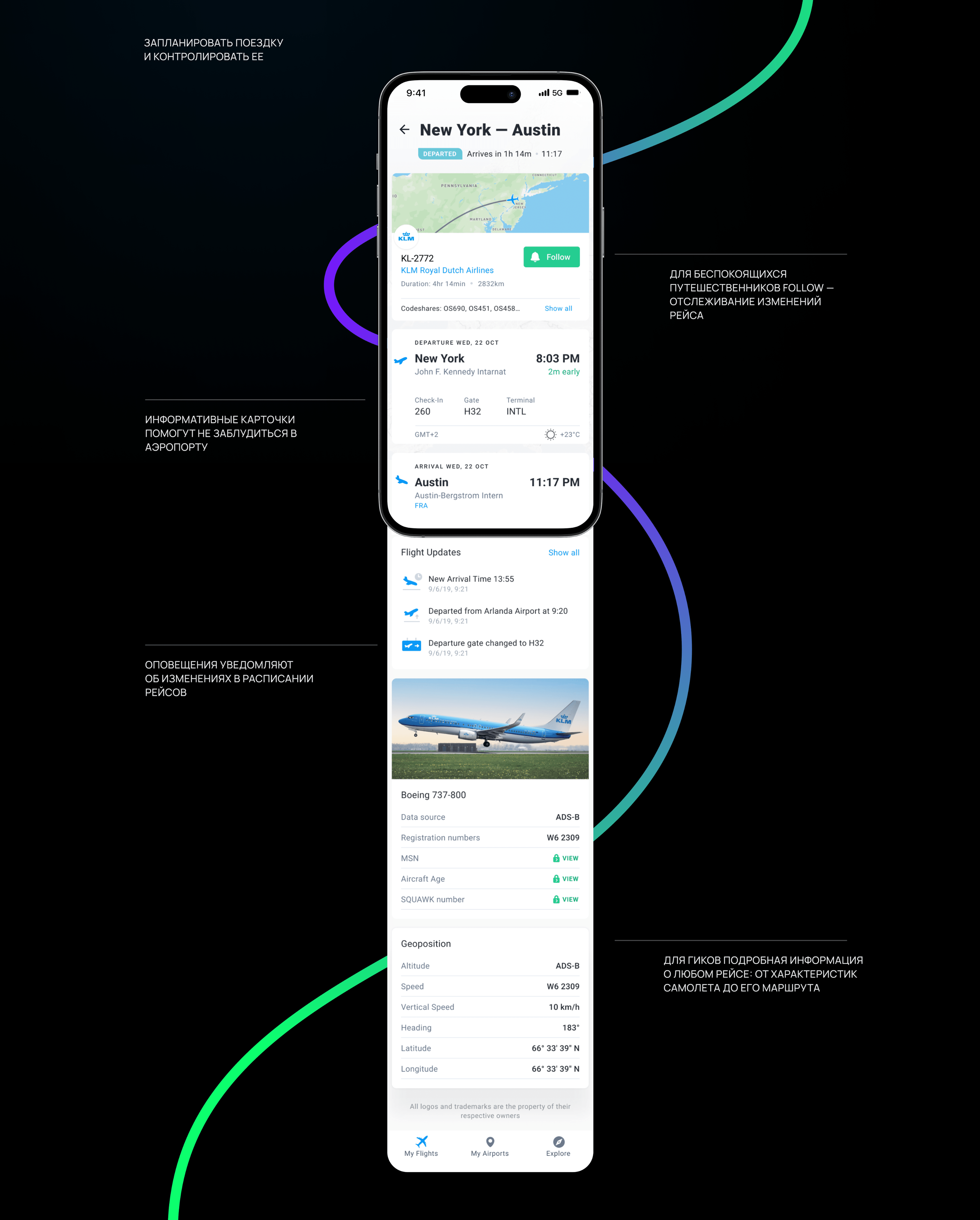 Встречать близких тоже стало удобнее. Пользователь видит все изменения полета и будет около нужного гейта вовремя. На карте в реальном времени отображается текущее положение самолета. Анимация оснащена мощнейшей успокоительно-медитативной функцией.