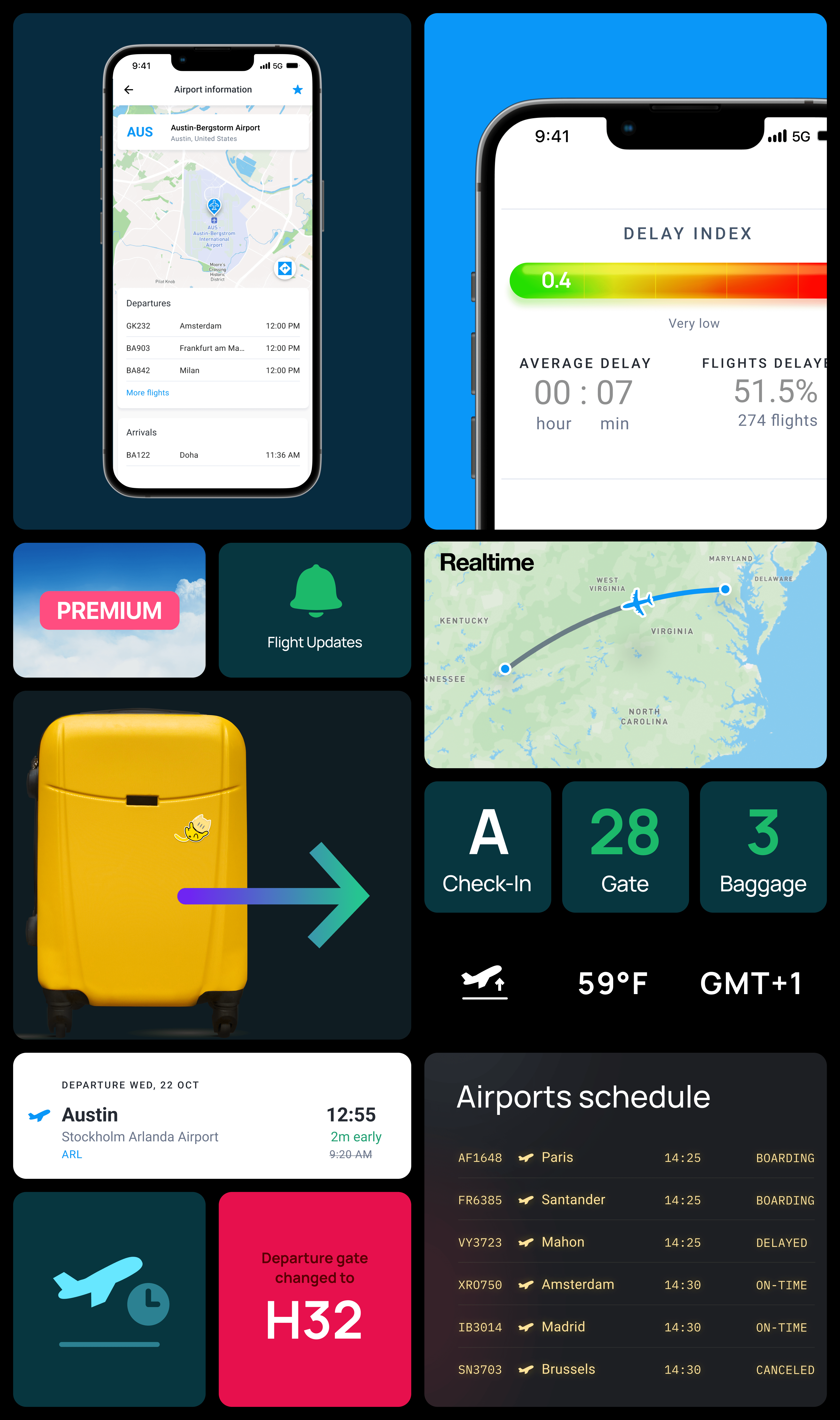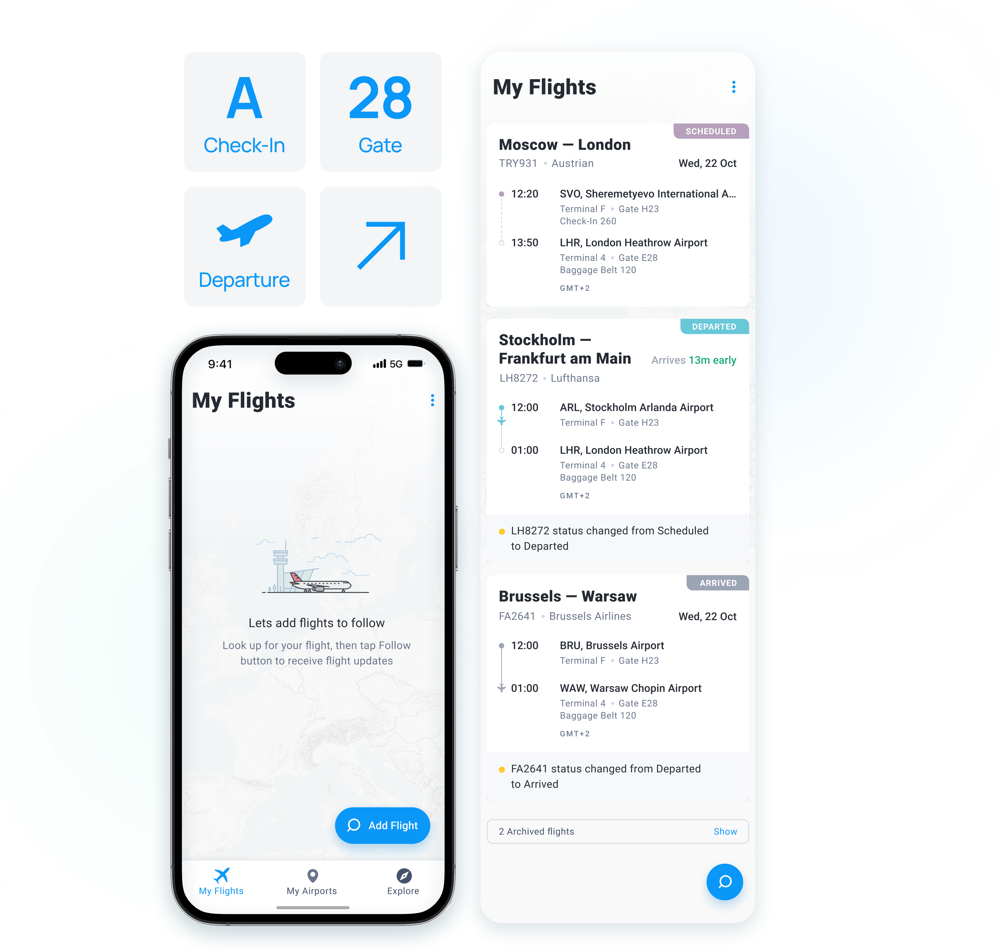 С любовью отрисовали инфографику статусов рейсов и вылетов, которая мягко уведомляет пользователей.