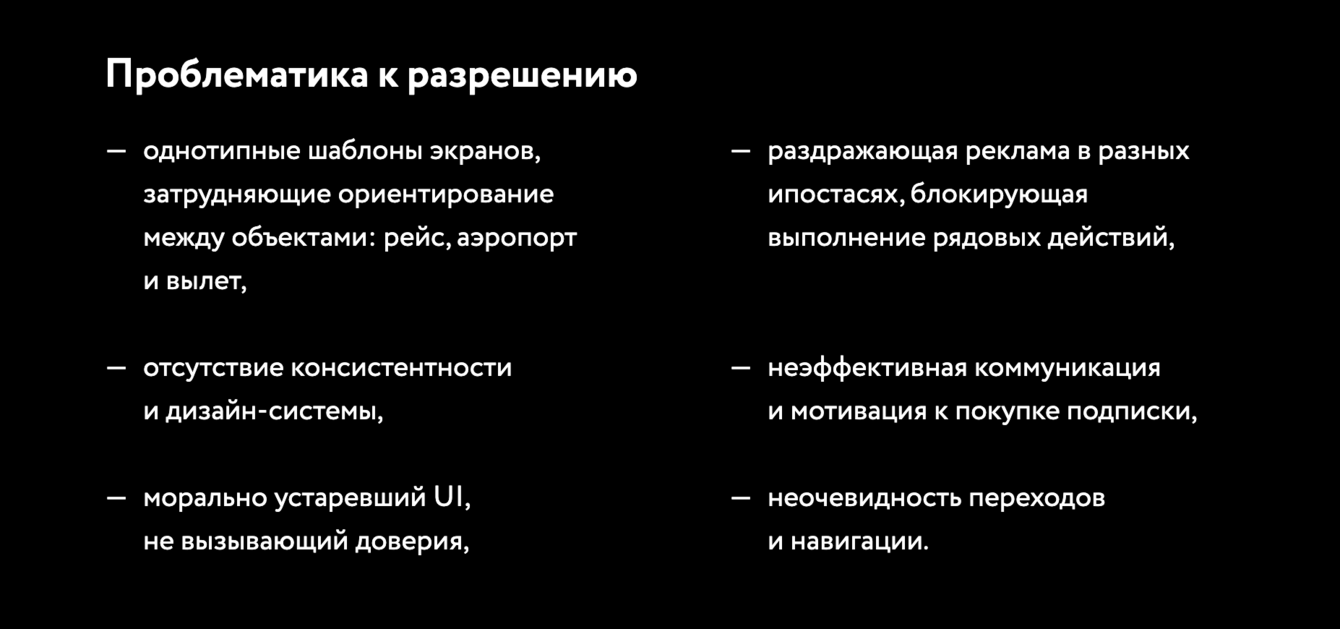 Разбираем приложение по процессам и экранам, группируем по нескольким ролевым моделям: путешественники, встречающие, флайвотчеры. Определяем свойственные им запросы и типичные флоу. Фиксируем проблемы и недостатки UX/UI в процессе реализации этих сценариев. Вырабатываем рекомендации, учитывая бизнес-цели: повышение конверсии в подписку, разумное количество рекламы без кардинальных выпилов и потерь в выручке.