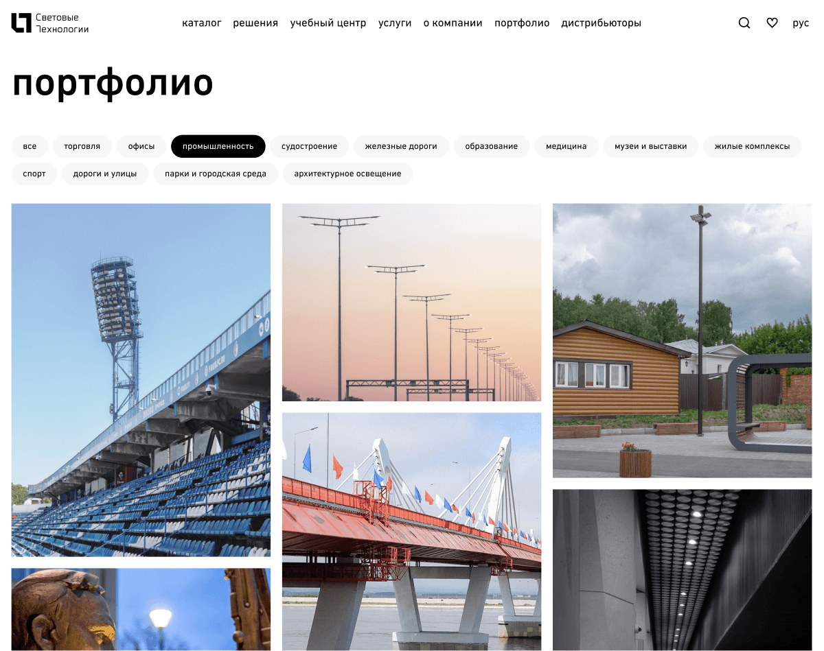 Сегментировать светотехнические решения для разных сфер использования было решено благодаря цветовому кодированию. Товары для промышленных предприятий, образовательных или спортивных учреждений и городской инфраструктуры выделены своим цветом, что упрощает навигацию и выделяет спектр решений для индустрии в самостоятельный мини-каталог.