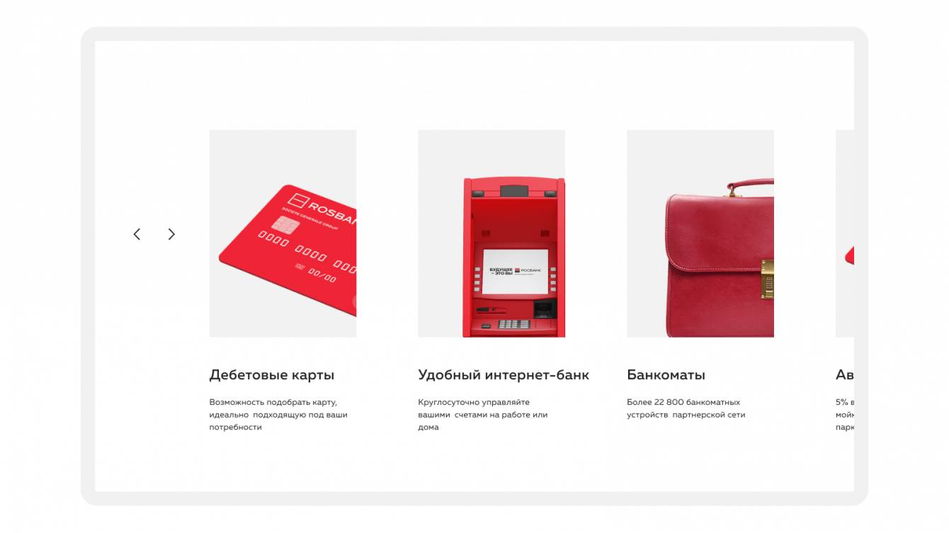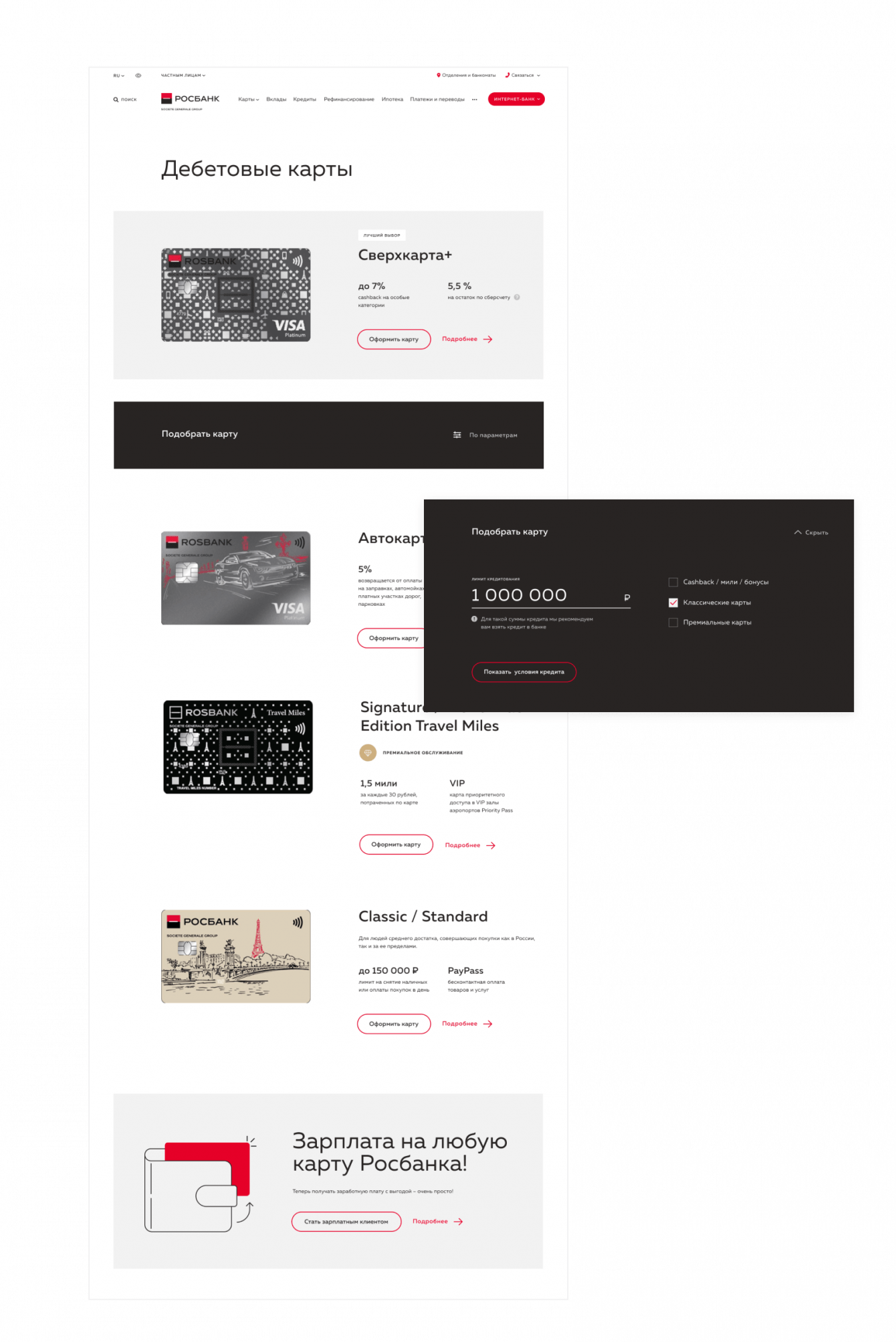 Сайт Росбанка объединяет многие направления: инвестиции, розничный, малый, средний и крупный бизнесы, недвижимость, премиальное обслуживание и так далее. Сделали единый инструмент для всех задач. У каждого раздела своя логика структуры для комфорта клиентов.