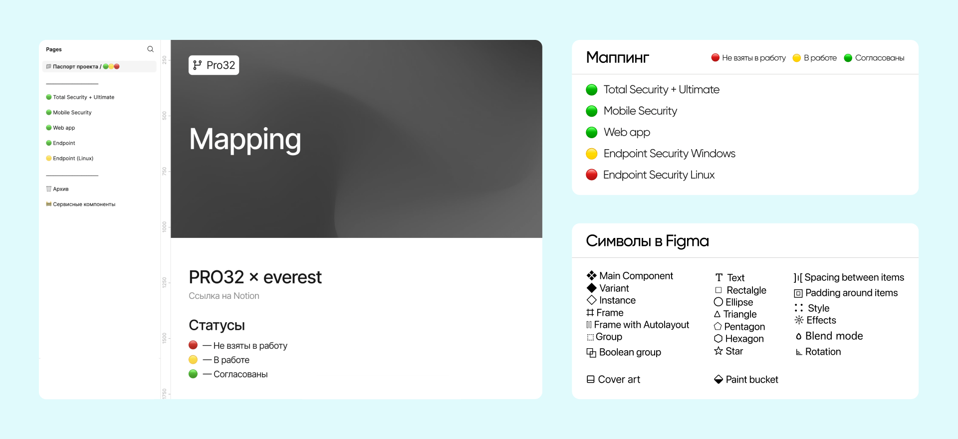 Из-за языковых и процессных барьеров возникла задача оптимизировать процесс совместной работы и свести к минимуму непонимание и разночтение информации со стороны всех участников. Для этого создали понятную всей команде структуру рабочего пространства в Фигме, обговорили правила, маркировки и статусы работ.