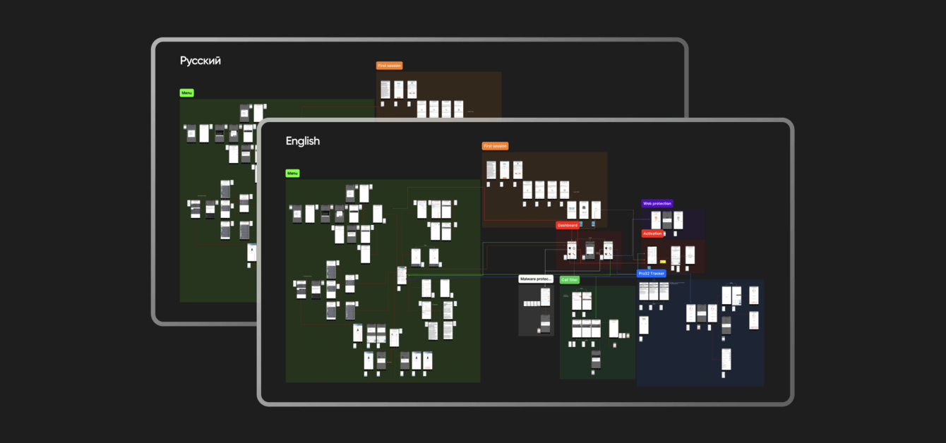 Специально для наших коллег-разработчиков писали инструкции и комментарии на английском языке, каждый раздел приложения и сценарии внутри него выводили в отдельный фрейм, в котором новые русскоязычные макеты со связями раскладывали вместе со старыми на английском и русском языках. Это помогало не терять логику и порядок макетов из-за языкового барьера и легко ориентироваться в большом массиве информации.