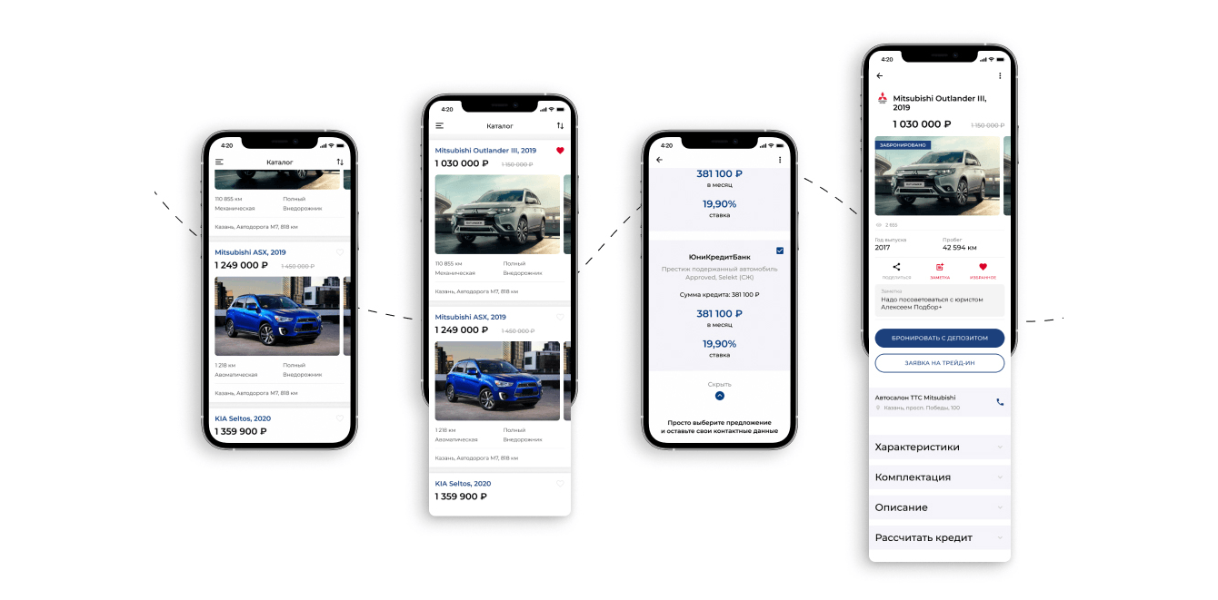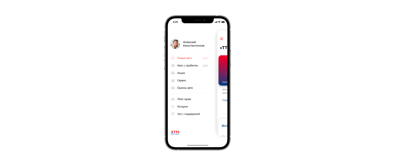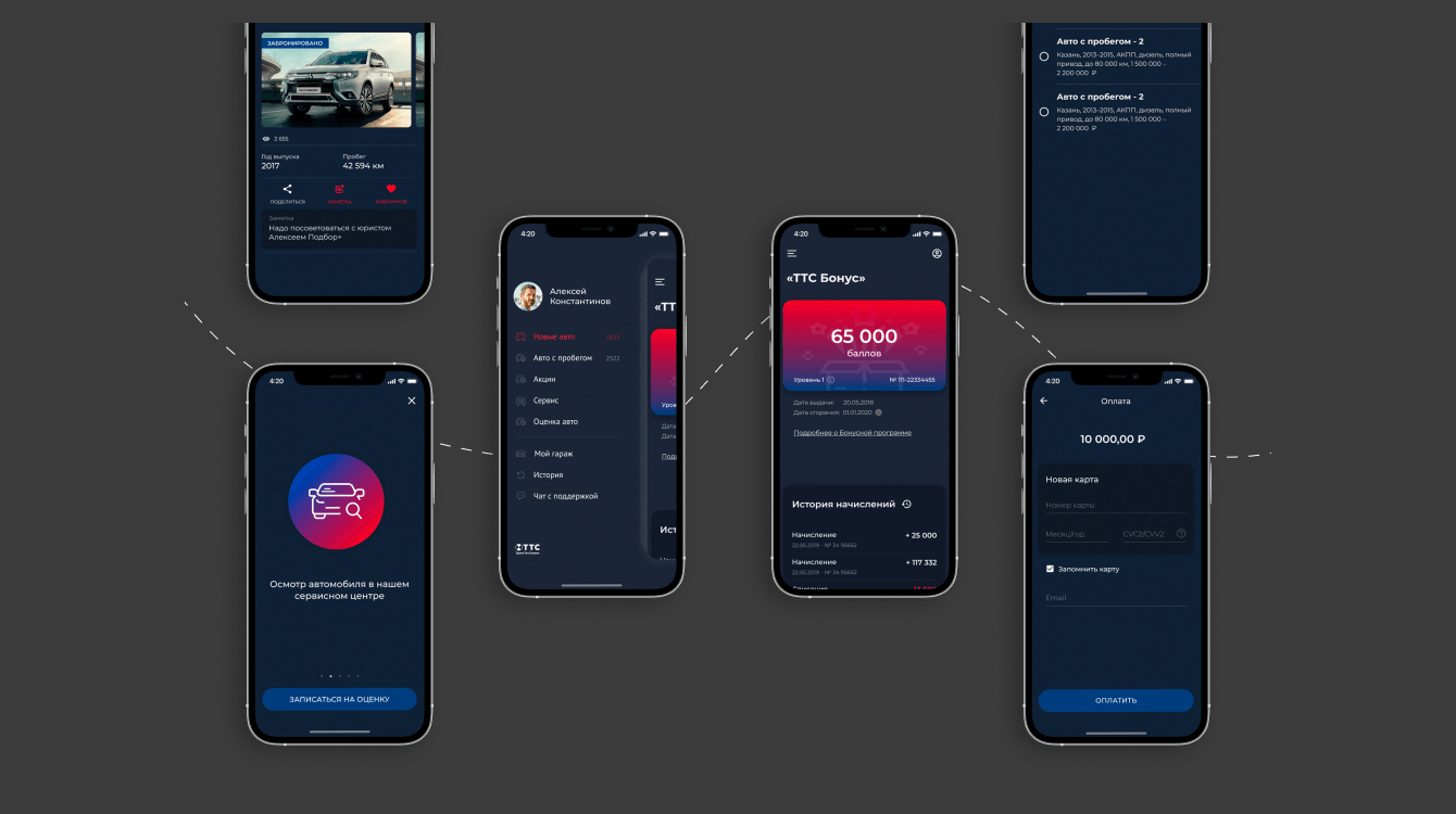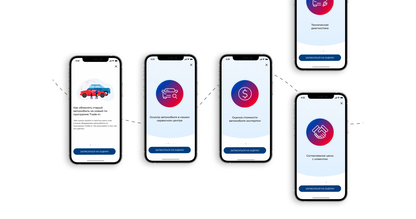 Компания «ТрансТехСервис» предлагает своим клиентом воспользоваться услугой Trade-in. Подготовили 4 экрана для каждого шага записи на оценку автомобиля.