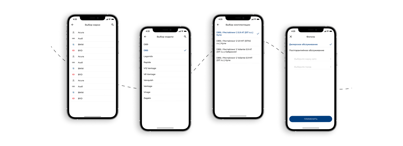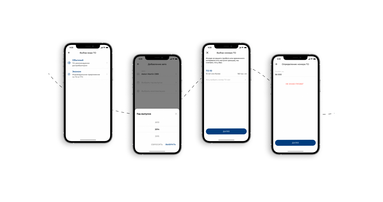 Через приложение можно записаться на техническое обслуживание. Для записи нужно указать марку машины, выбор вида ТО, пробег, комплектацию, модель. Затем автоматически рассчитывается какой номер обслуживания необходим, его можно выбрать вручную.