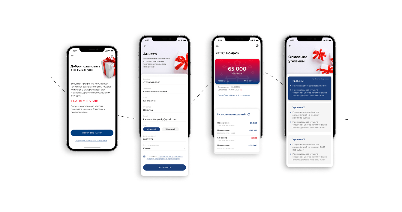 У Заказчика уже имелись мобильные приложения, размещенные в сторах. Первой задачей было создание дизайна экранов нового раздела «Бонусная система». Нужно было разработать UI-дизайн приложения по готовым UX-макетам. При этом, не нужно было ориентироваться на внешний вид существующих экранов — их тоже планировали обновить: сделать более современными и понятными, добавить функционал.