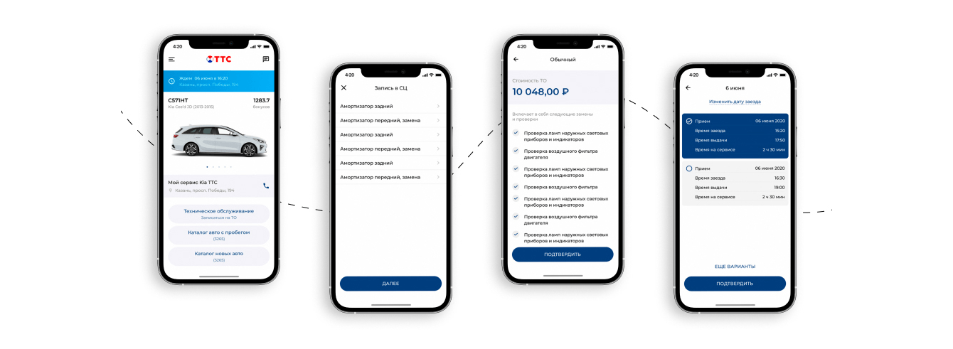 Перед подтверждением записи появляется экран с перечнем услуг и общая стоимость ТО. Когда пользователь записался, на экране выводится напоминание о записи: адрес сервиса, дата и время.